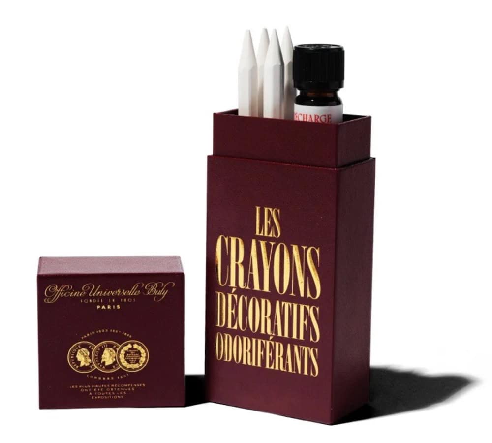 The decorative ceramic pencils complement any desk or bookshelf; the antique-style scented Alabaster stone is a small object that can fit just about anywhere; the metal box can be dangled from a hanger, a door knob or in the car; and the discreet scented matches can wipe out any unpleasant odour in a strike.