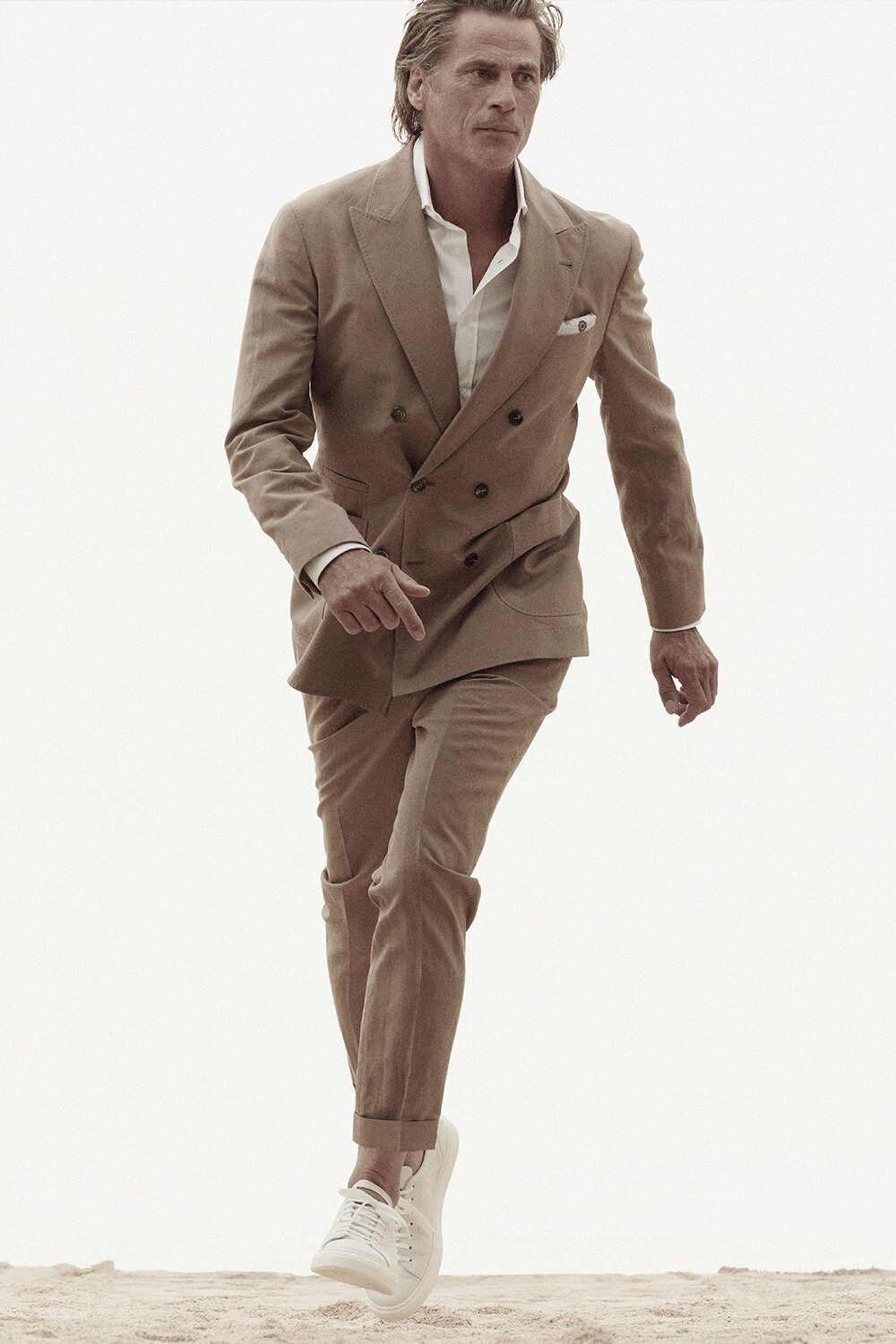 Make of this what you will but look to the catwalks and it’s apparent that brown is now being proffered as an option in suiting. Don’t think ill of brown, it’s a great shade: serious but warm, dark without being the more predictable navy or grey, kind to all skin tones. But pulling off a brown suit takes forethought – be careful to break up your ensemble with some light but complementary shades, the likes of a chambray shirt or baby blue tee, or a charcoal polo, for instance.