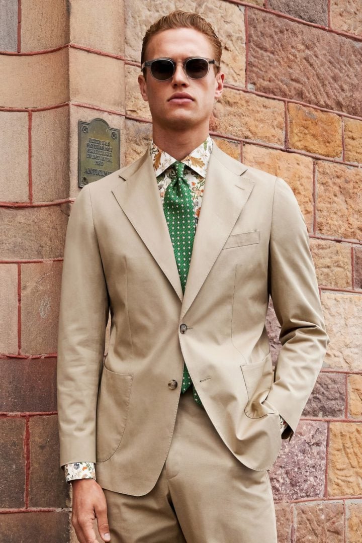 That might feel like a dandy step too far, so an easy way to embrace the fun in modern tailoring is with accessories. Brooches, lapel chains and neck scarves instantly transform a suit, even those steeped in old-school tradition, like pinstripes. You could also try a statement cowboy belt or an eye-catching man bag. And it’s an affordable hack to give your existing suit line-up a new vibe.