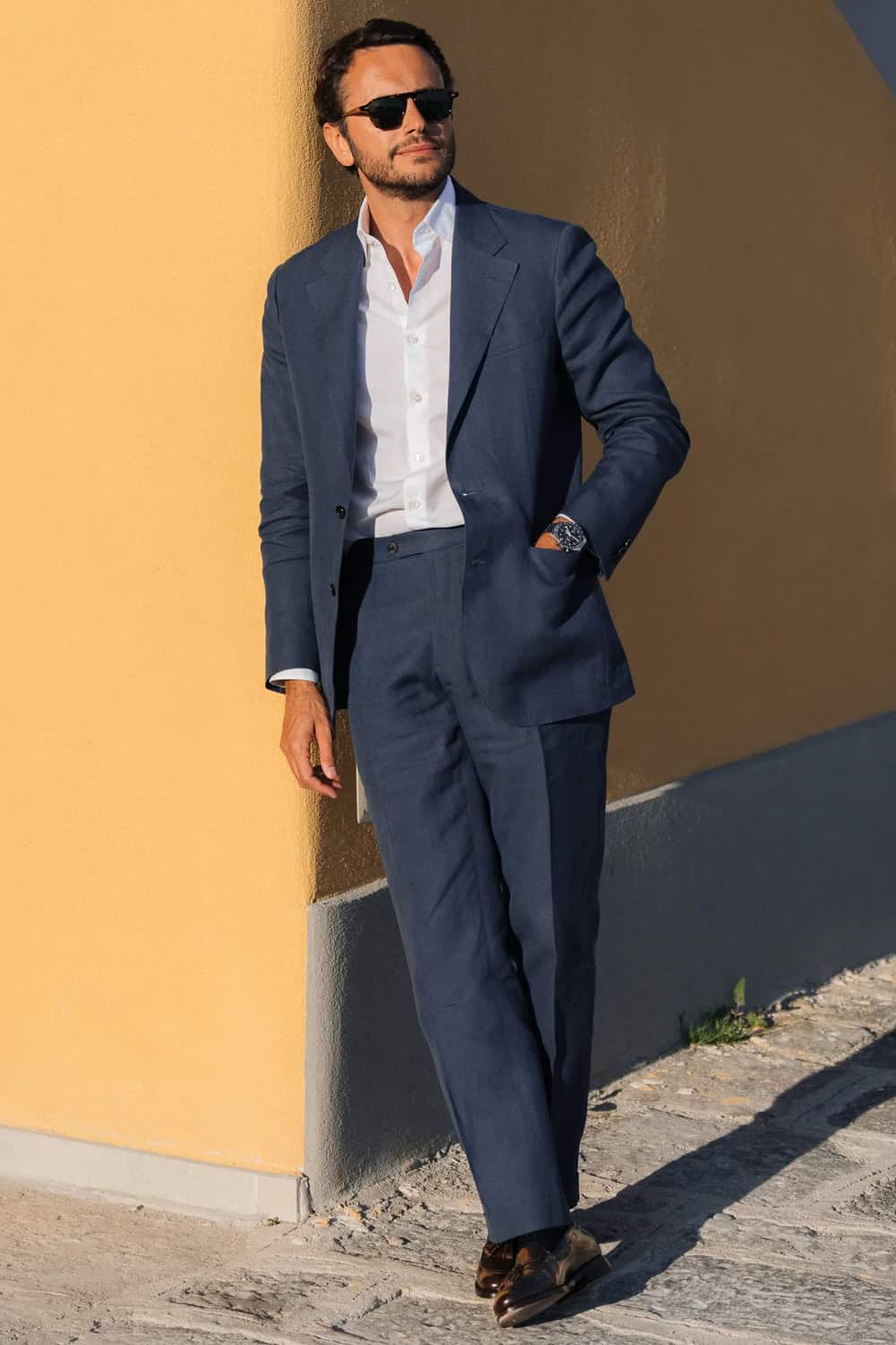 For example, a will-fitting, sand-coloured linen two piece may sound a bit bland. However, team it with a chambray shirt, a patterned pocket square and some laid-back suede loafers and you’ll soon change your mind.