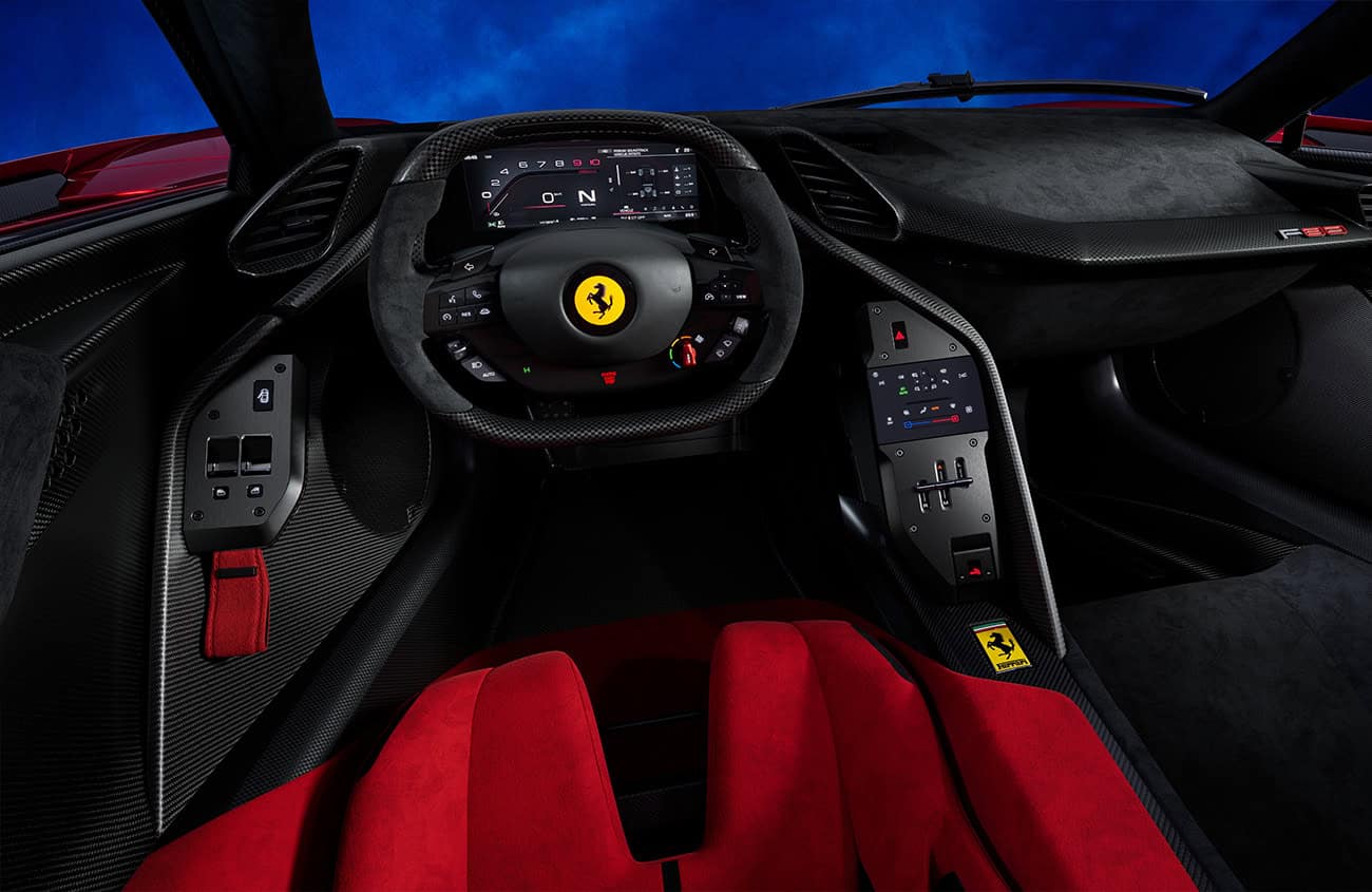 Rather than requiring excessive weight management, the active suspension here is designed to support the astounding amount of downforce F80 can create. Add to this the all-new carbon tub, 3D-printed suspension components, clever staggered driving position and Ferrari’s first carbon fibre five-spoke wheels, and this is a tour-de-force of high-performance tech that might just more than make up for the slightly disappointing cylinder count.