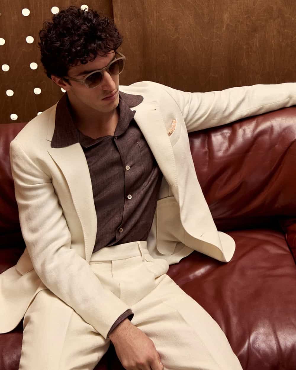 Contrary to popular belief, it is possible to wear a linen shirt with a suit and make it look good. The key is mixing your materials to create texture and depth. Therefore, swerve the linen-on-linen combos and instead try your shirt with a wool or cotton suit in a contrasting colour. For example, a navy suit with an off-white shirt, or a beige suit with a light blue shirt. Striking this balance between light and dark will work alongside the differing textures to add a subtle complexity to the outfit.
