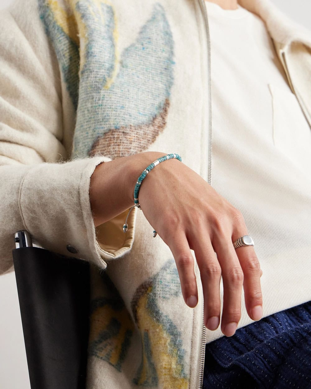 Similarly, a beaded bracelet is a small, subtle addition that’s just enough to add a pop of colour to an otherwise muted, understated outfit.
