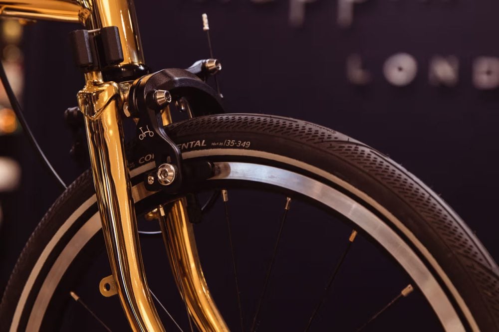 Iconic British bike brand Brompton has teamed up with British jeweller Mappin & Webb for a world-first in personal transportation. Only two of the limited gold bikes are available, each built with one ounce of gold, equivalent to approximately 24-carat yellow gold.