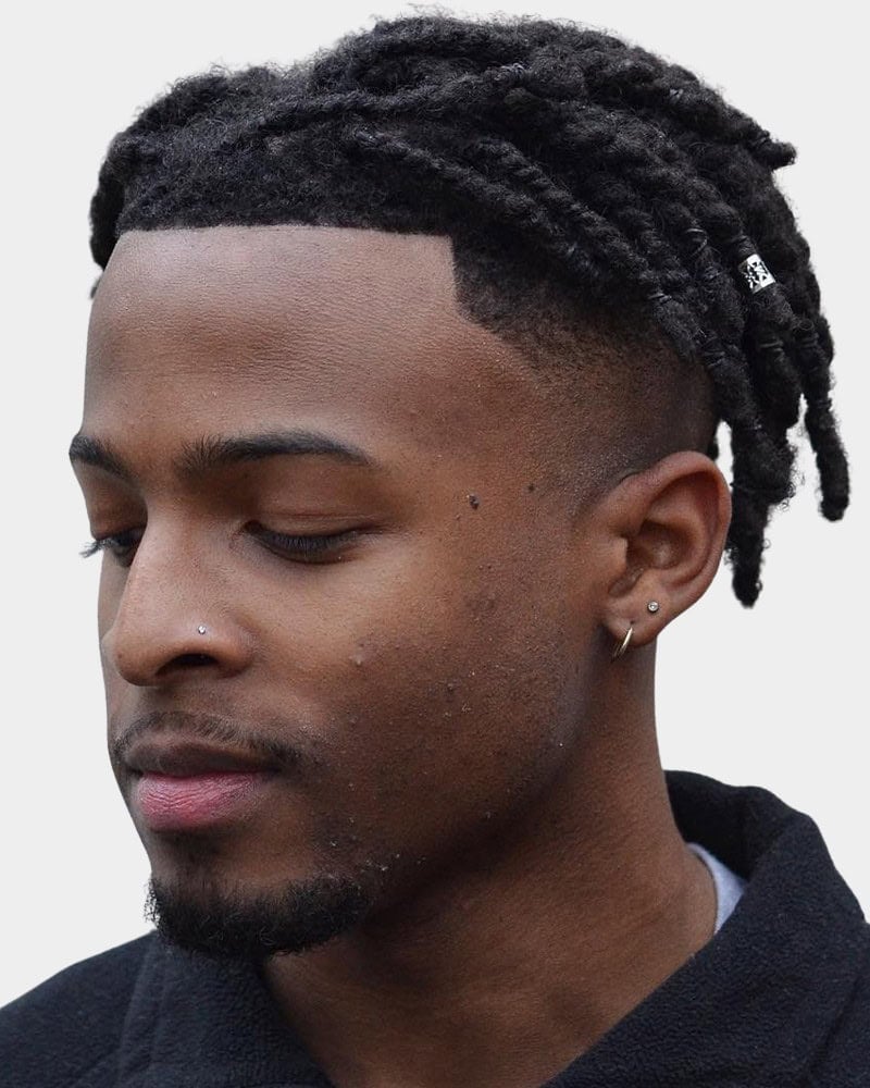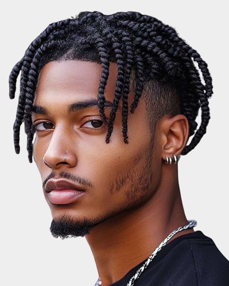 This style combines clean, low-maintenance sides with playful texture up top. Twists are easy to install and style, while the fade keeps everything sharp. We’d recommend opting for a low or temple fade to ensure all the focus remains on the twists themselves.