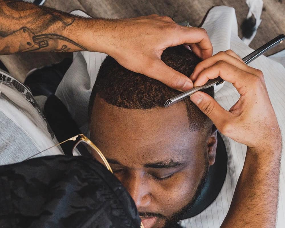 A clean, defined outline around the hairline, temples and sometimes beard. It’s created using a razor or unguarded clippers. Essential for a crisp finish.