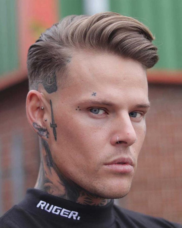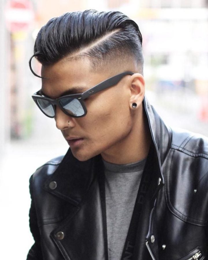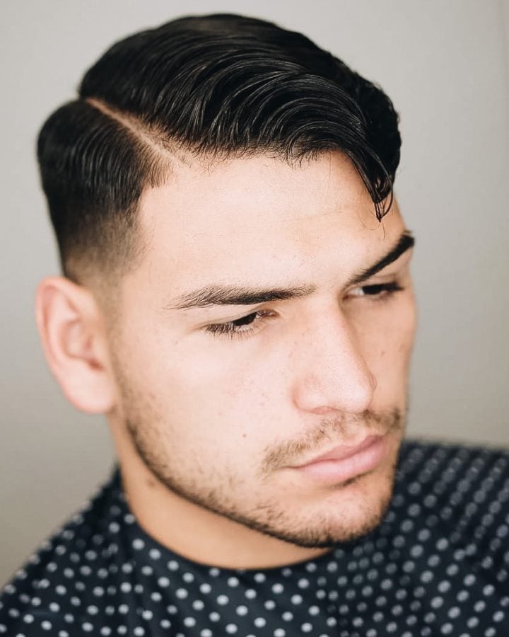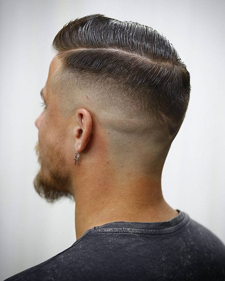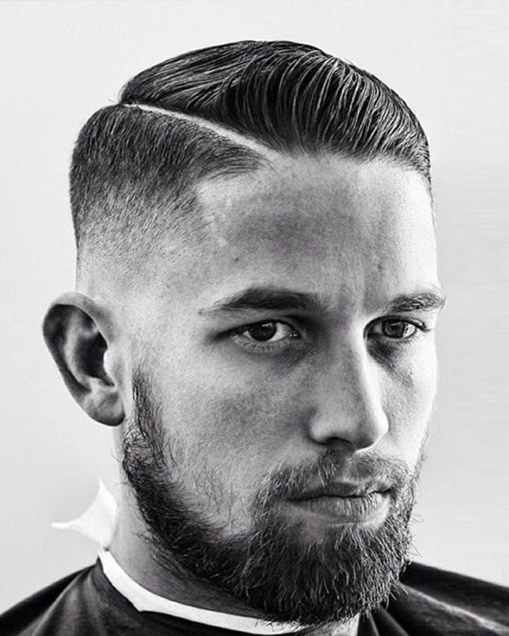 For a slightly harsher look, this variation accentuates the side parting by having it cut in. It’s much like the classic comb over fade, but the gap where the hair is parted is defined using unguarded clippers to shave the line in.