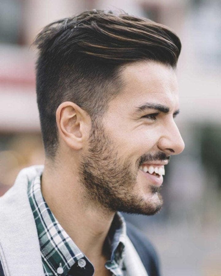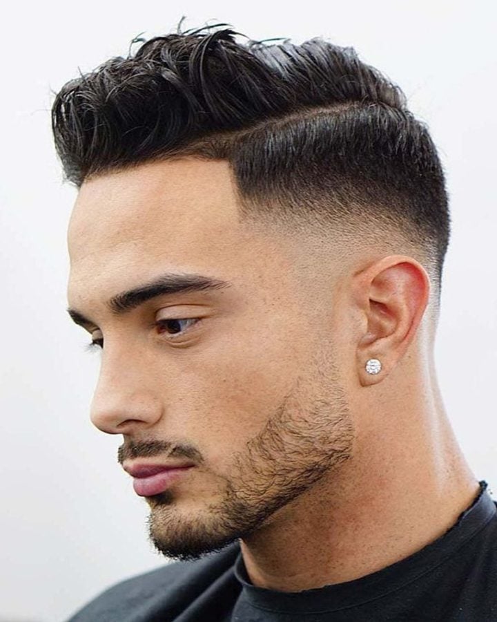 With longer length on top, this style has the hair styled up into a quiff rather than combed over to the side. It’s a good option for those with wide or round faces, who will benefit from the additional height created.