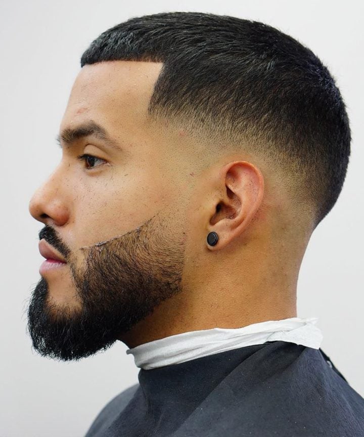 This closely clippered version keeps everything as neat and tidy as possible. The hair is buzzed short on top and even shorter at the back and sides, with that all-important fade. Because the hair is so short on top, a skin fade is often used at the back and sides. This allows the barber to maintain that faded look which comes from a graduation in length while keeping the hair extremely short.