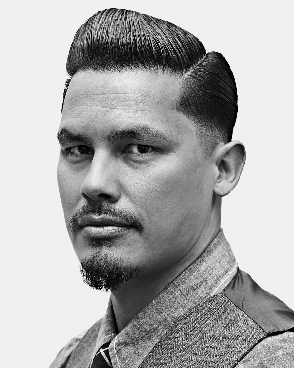 The pompadour is characterised by its voluminous front, which is styled up, away from the face and toward the back of the head. Because of this height on top, it’s best suited to those with round or oval faces. The short sides of the drop fade can elongate the face even further, so err on the side of caution if you already have a long face.