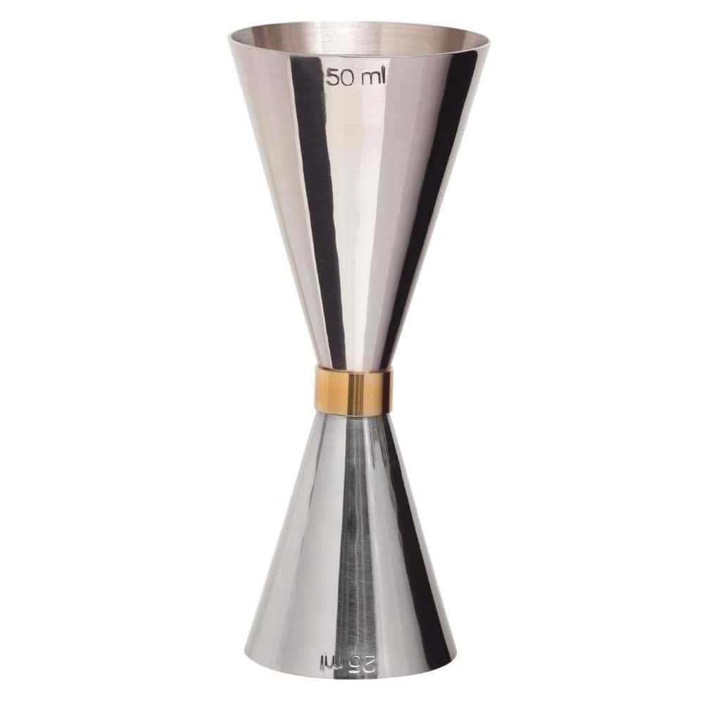 The final accessory in the bar arsenal. Better to have a couple of two-sided bar jiggers instead of all those spirit measures lying around. One side is 50ml, the other side is 25ml. Simple.