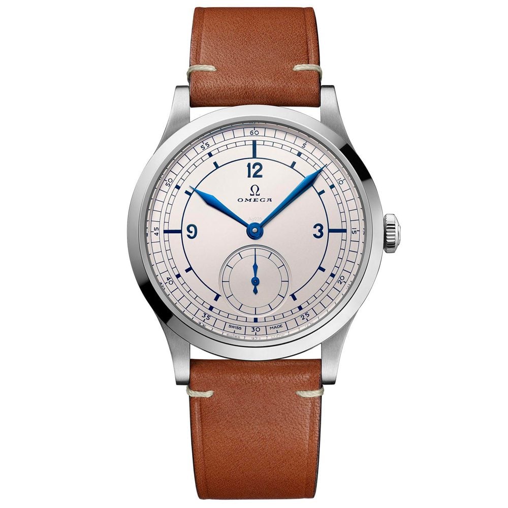 Hand-wound, with a silver dial inspired by an Omega design from 1939, a small seconds at six o’clock and Omega’s old logo on the dial, it’s a masterclass in subtle sophistication.
