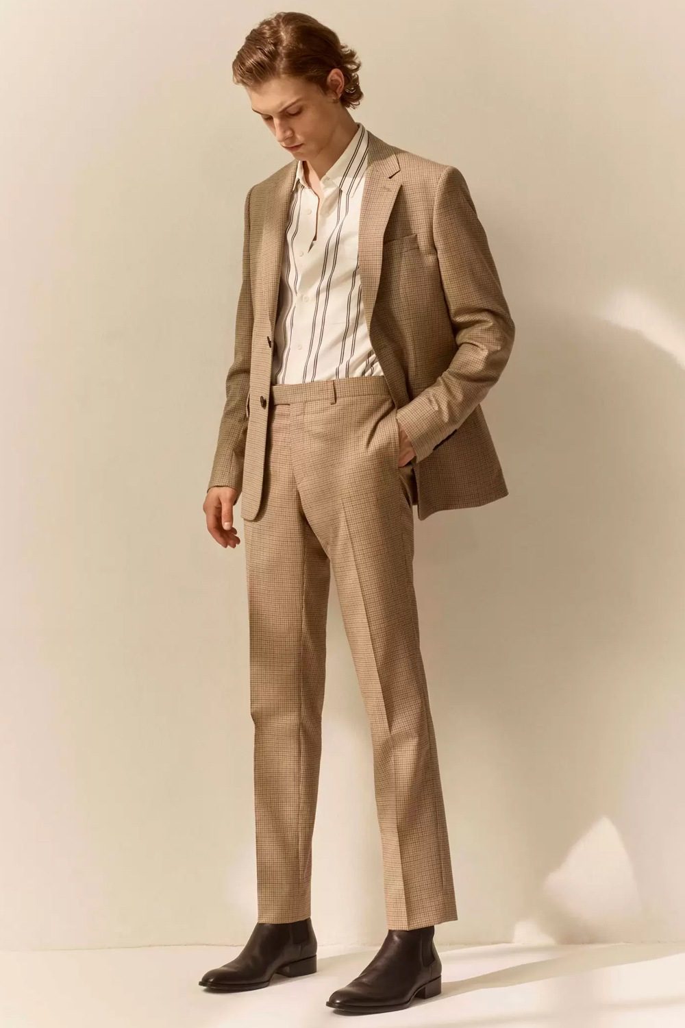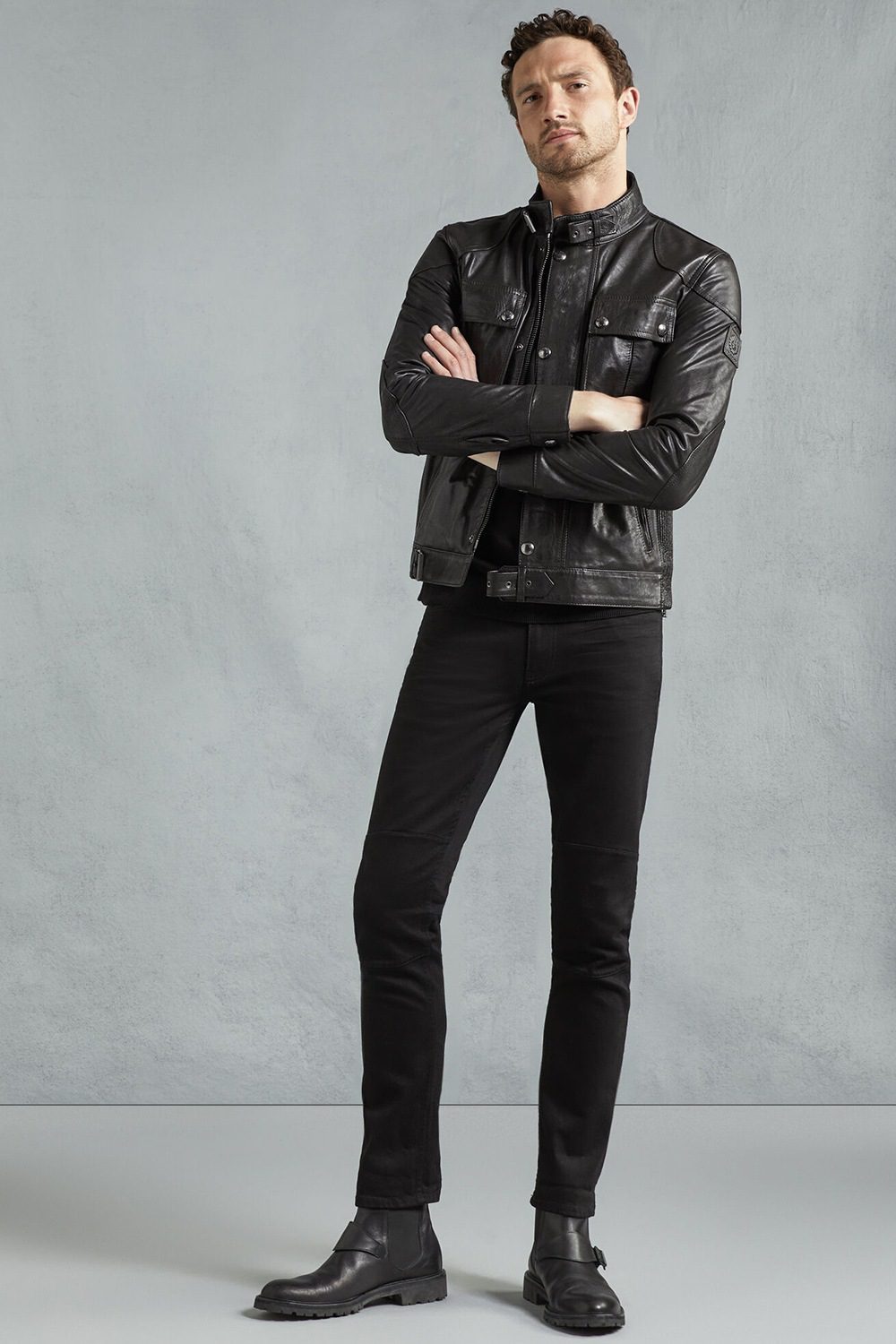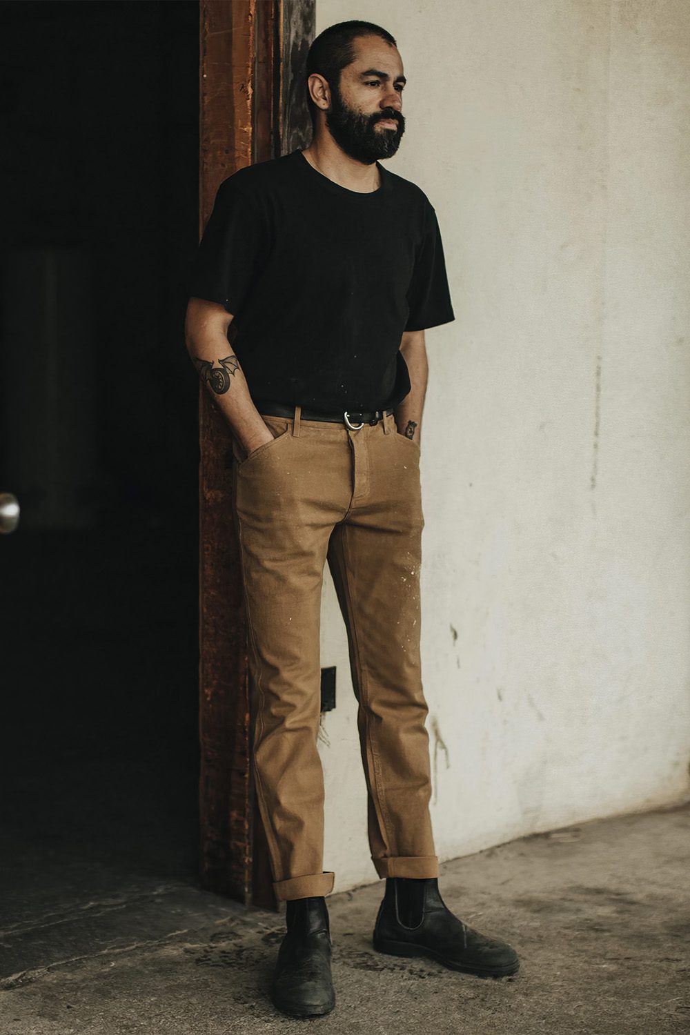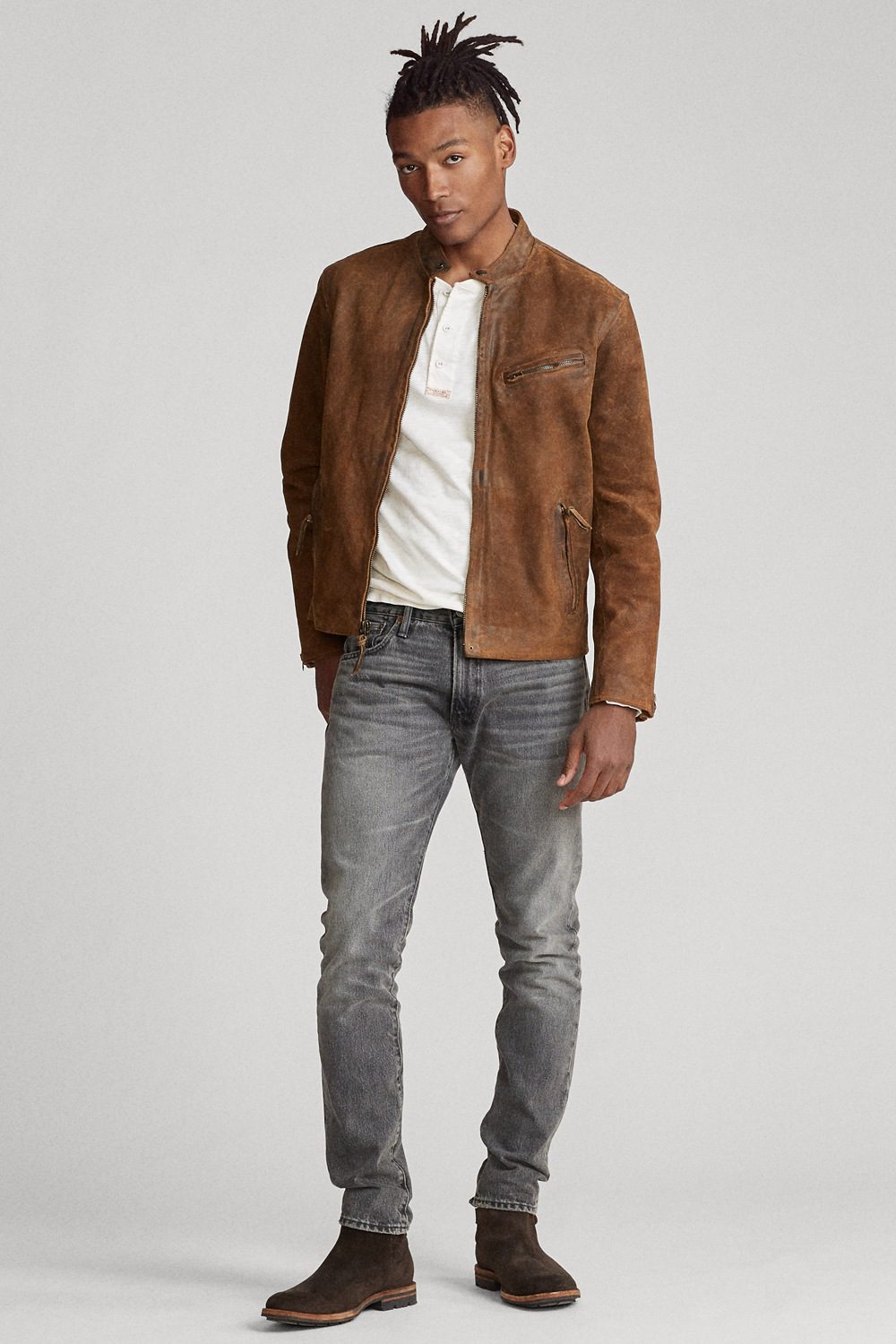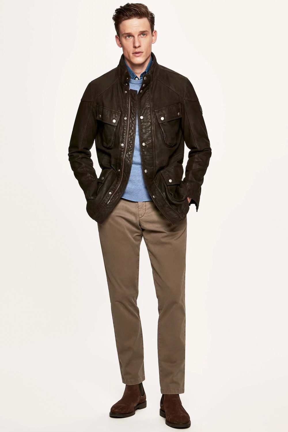 For a foolproof look that requires almost no thought, pair dark wash jeans with a classic white T-shirt and suede jacket or overshirt. If you’re looking for something smarter, try cotton twill khakis with an Oxford button-down and lightweight sweater, finished with a blazer or leather motorcycle jacket.