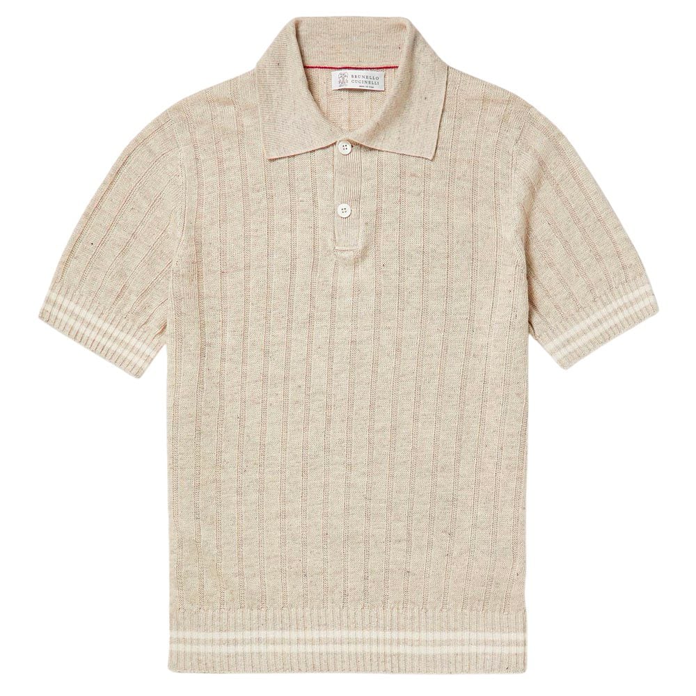 - Brunello Cucinelli Ribbed Striped Linen and Cotton-Blend Polo Shirt
