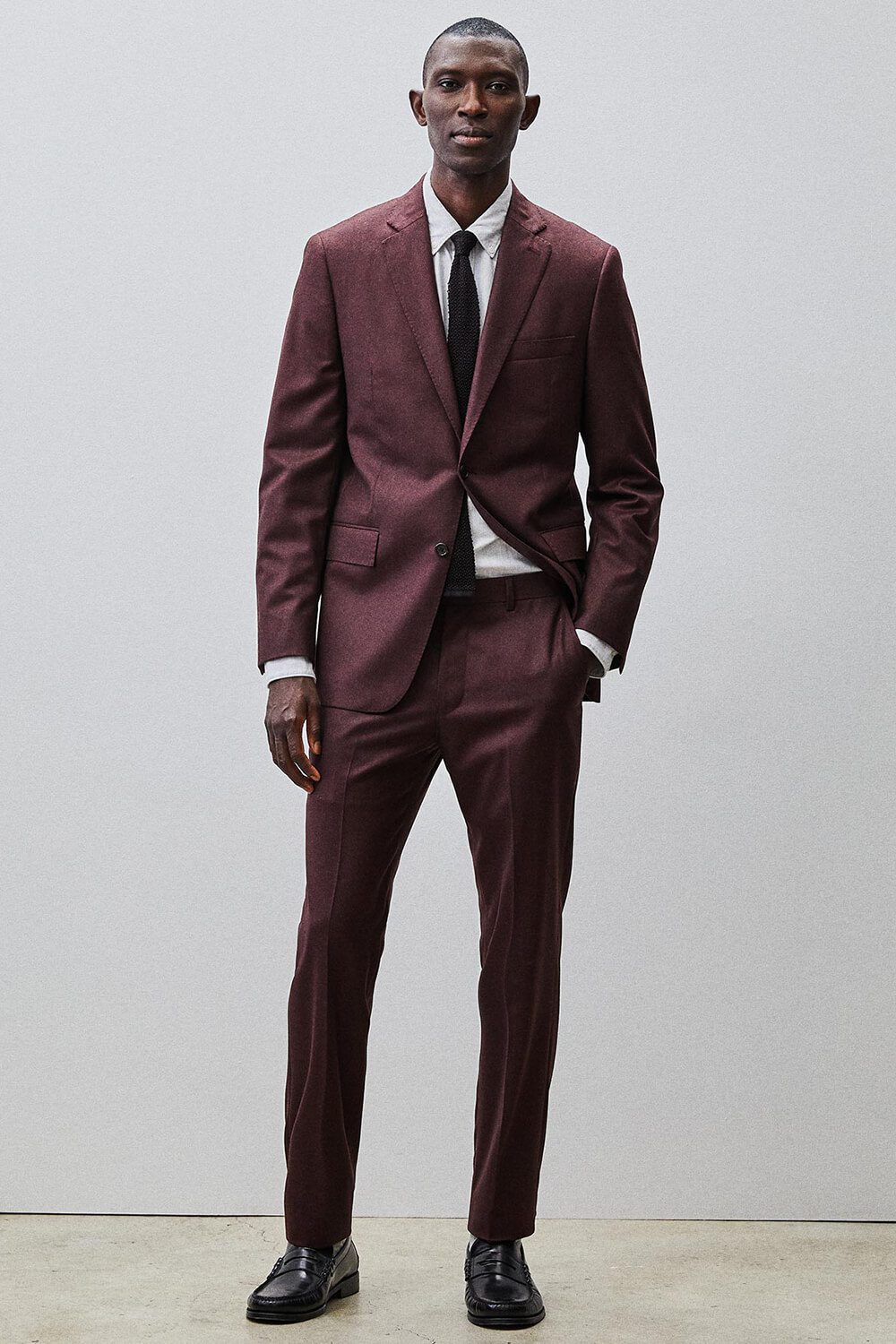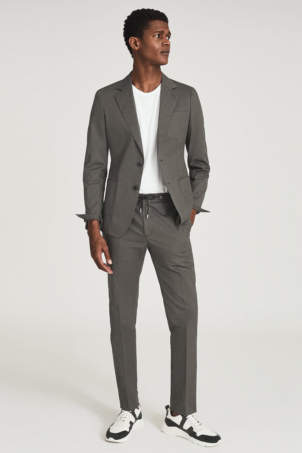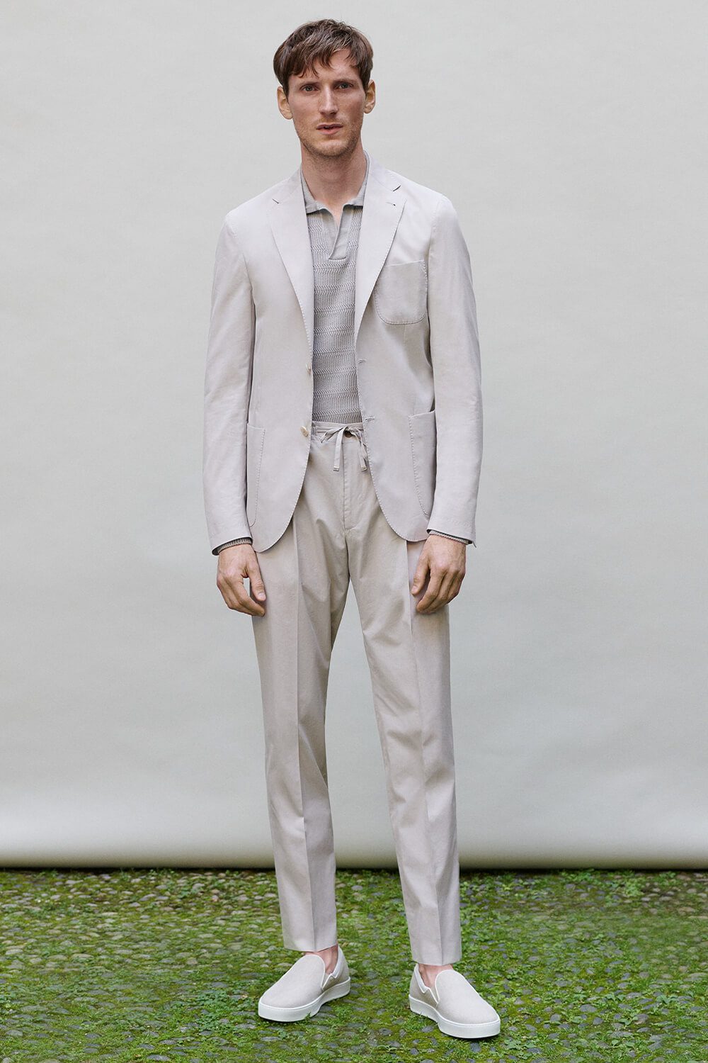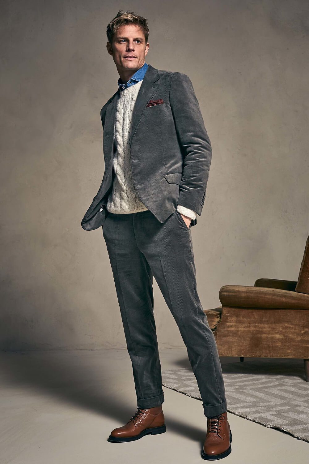 Look for two-piece garments that match, but which are softer, stretchier, techier and more unstructured than any ‘suit’ you’ve worn before. They may have elasticated waistbands. They may be stain- or wrinkle-resistant. They may even go in the washing machine.