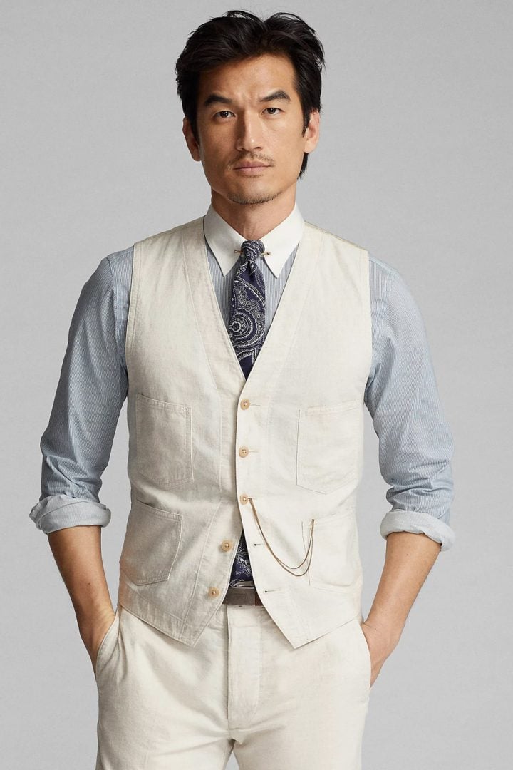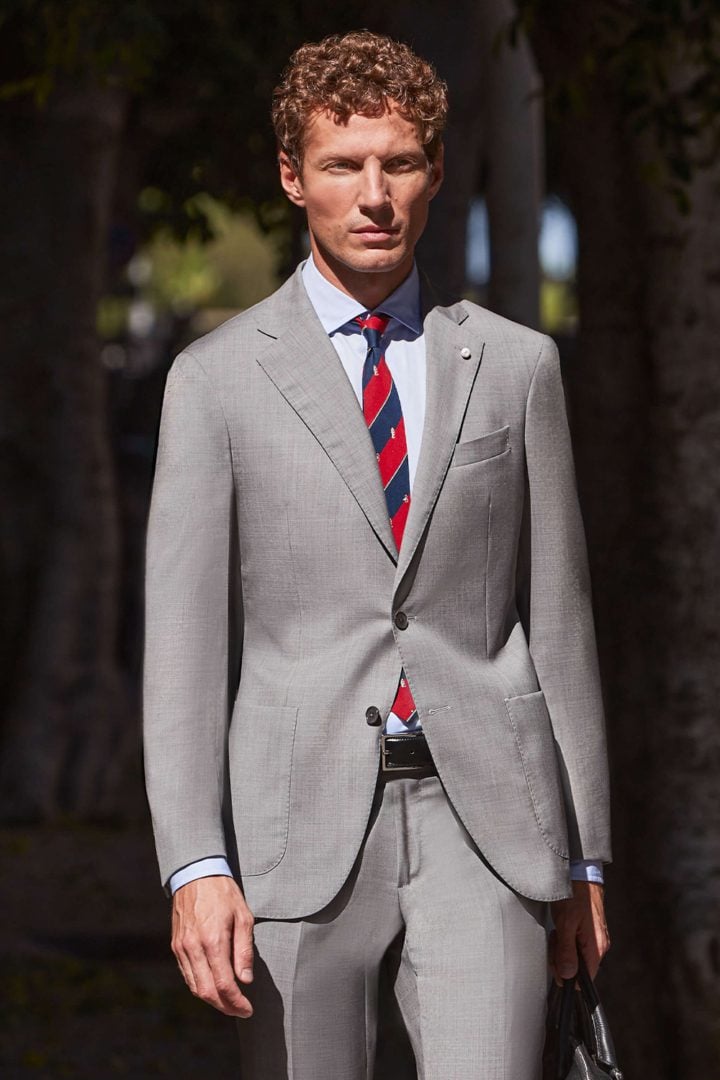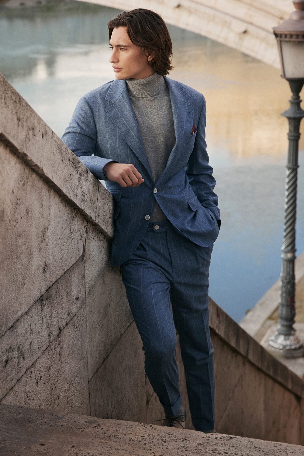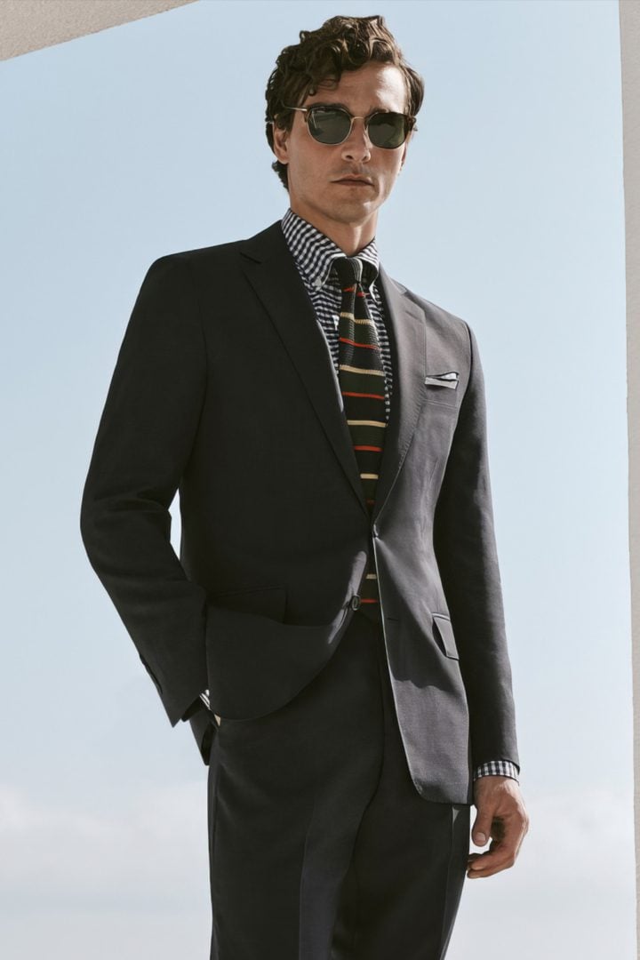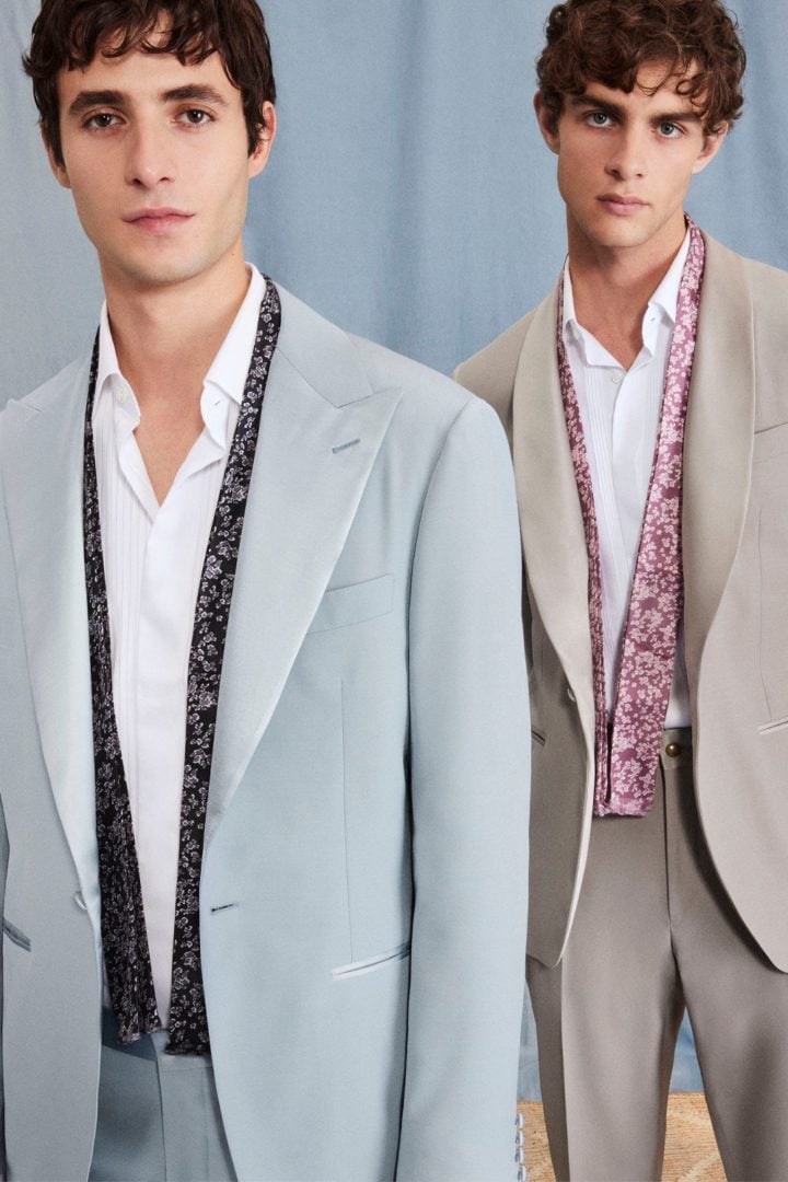 That might feel like a dandy step too far, so an easy way to embrace the fun in modern tailoring is with accessories. Brooches, lapel chains and neck scarves instantly transform a suit, even those steeped in old-school tradition, like pinstripes. You could also try a statement cowboy belt or an eye-catching man bag. And it’s an affordable hack to give your existing suit line-up a new vibe.