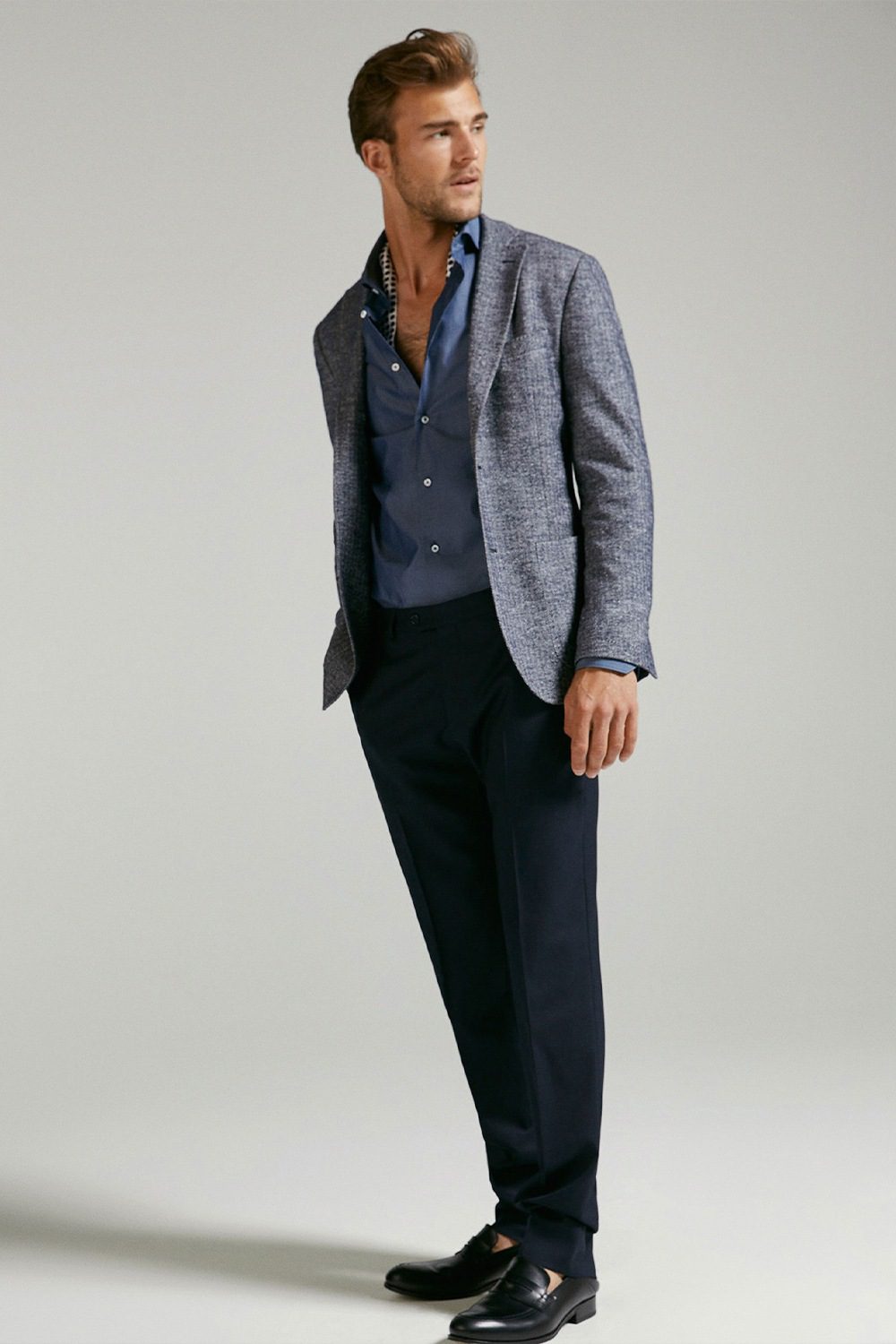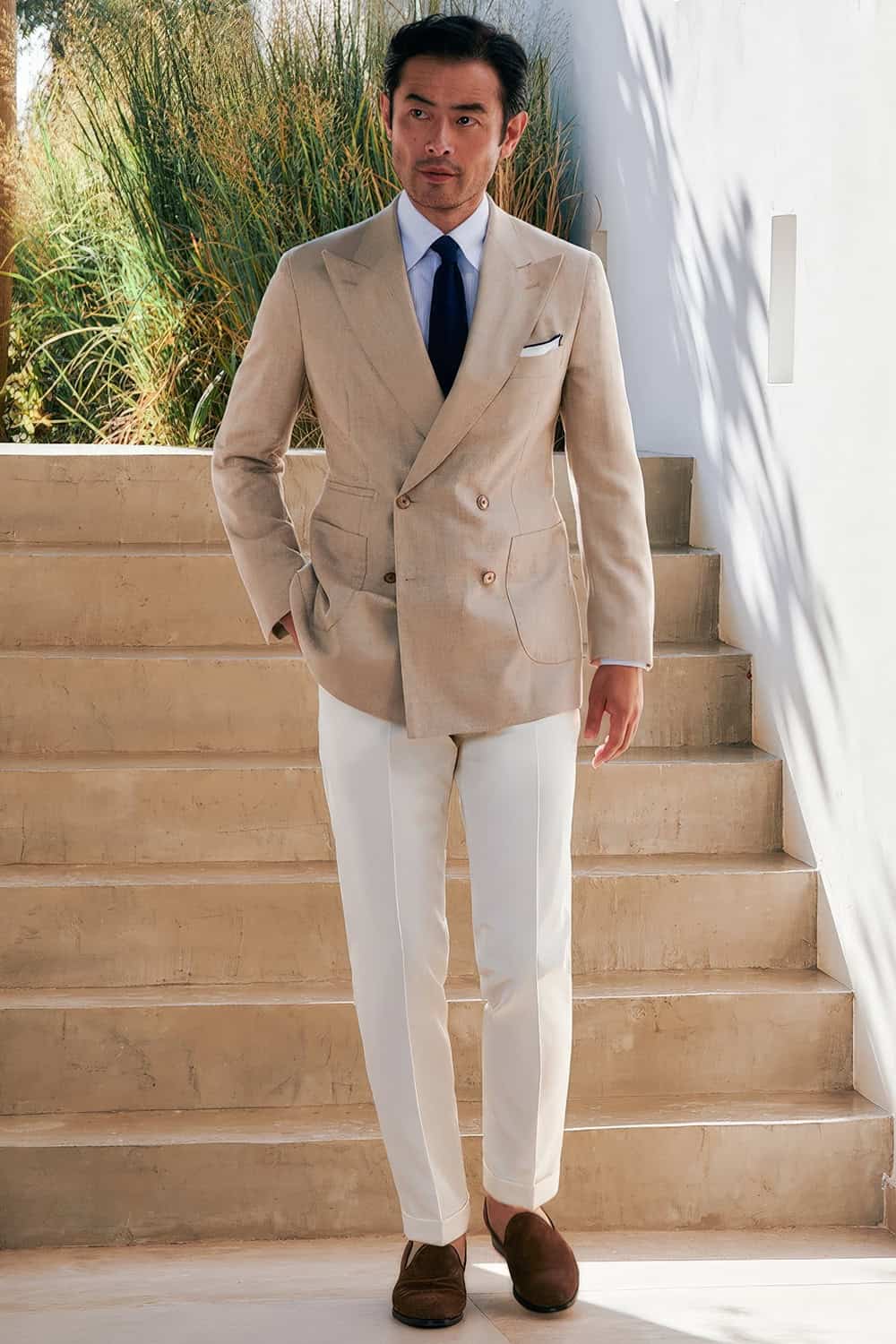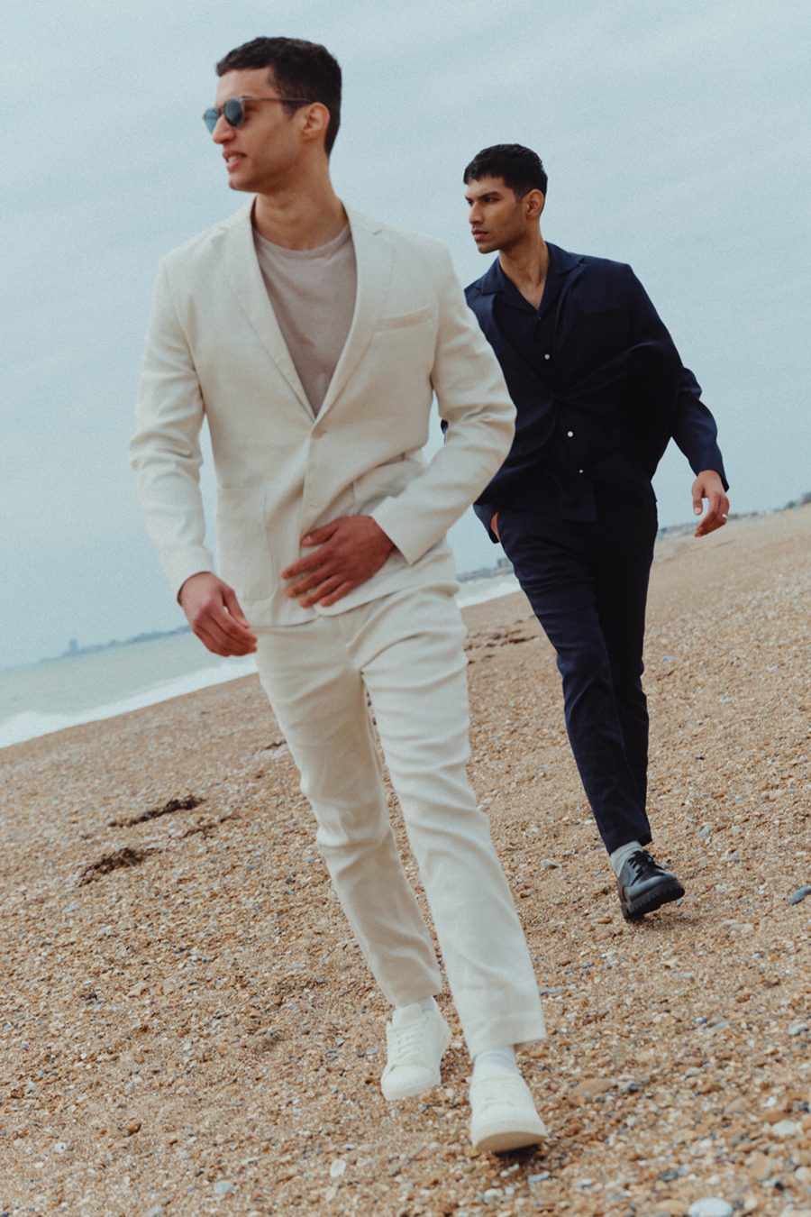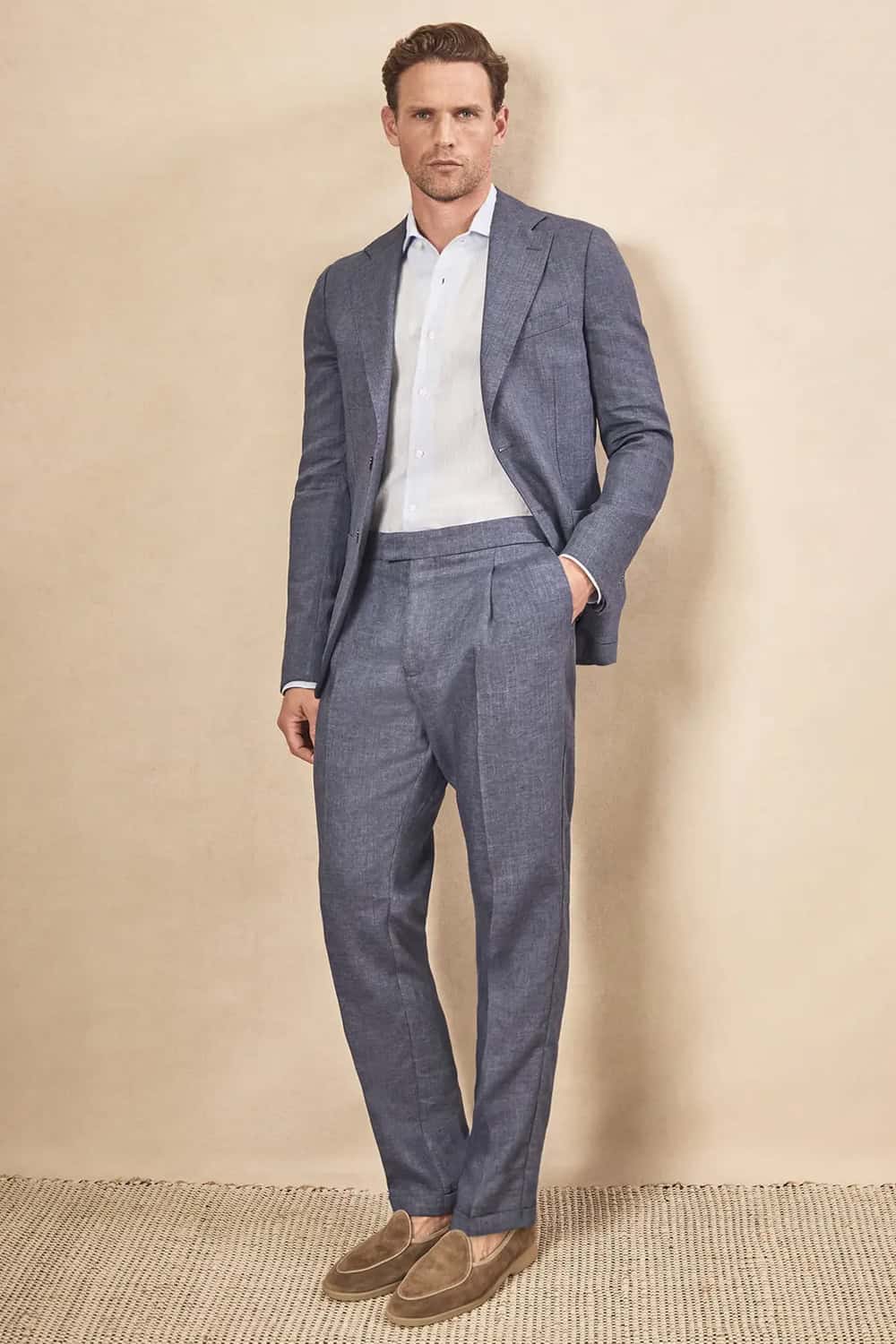 For example, a will-fitting, sand-coloured linen two piece may sound a bit bland. However, team it with a chambray shirt, a patterned pocket square and some laid-back suede loafers and you’ll soon change your mind.