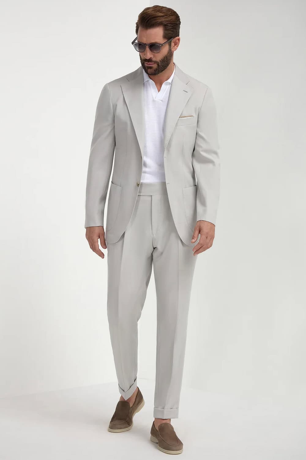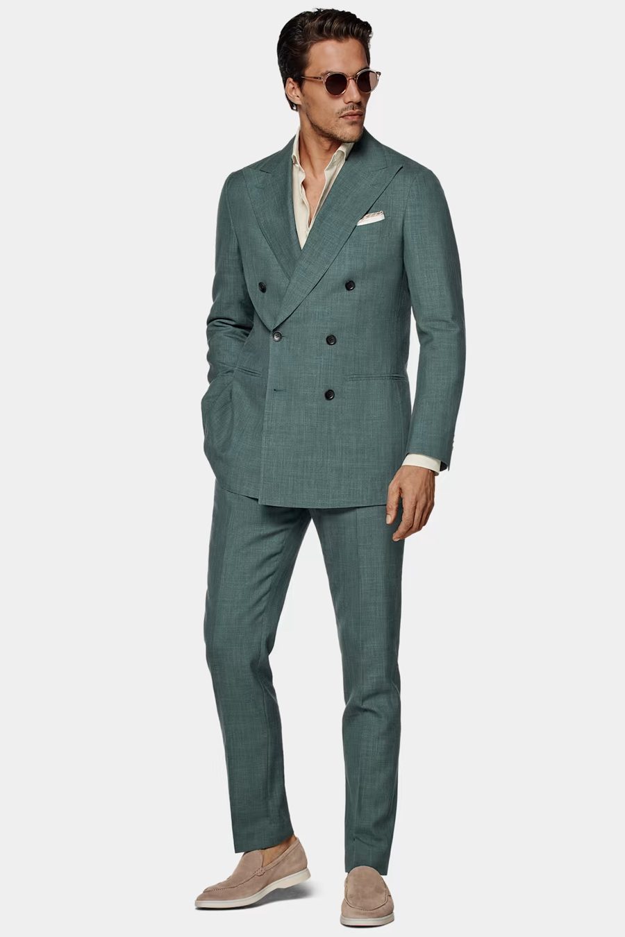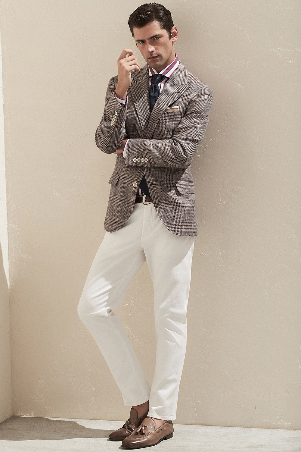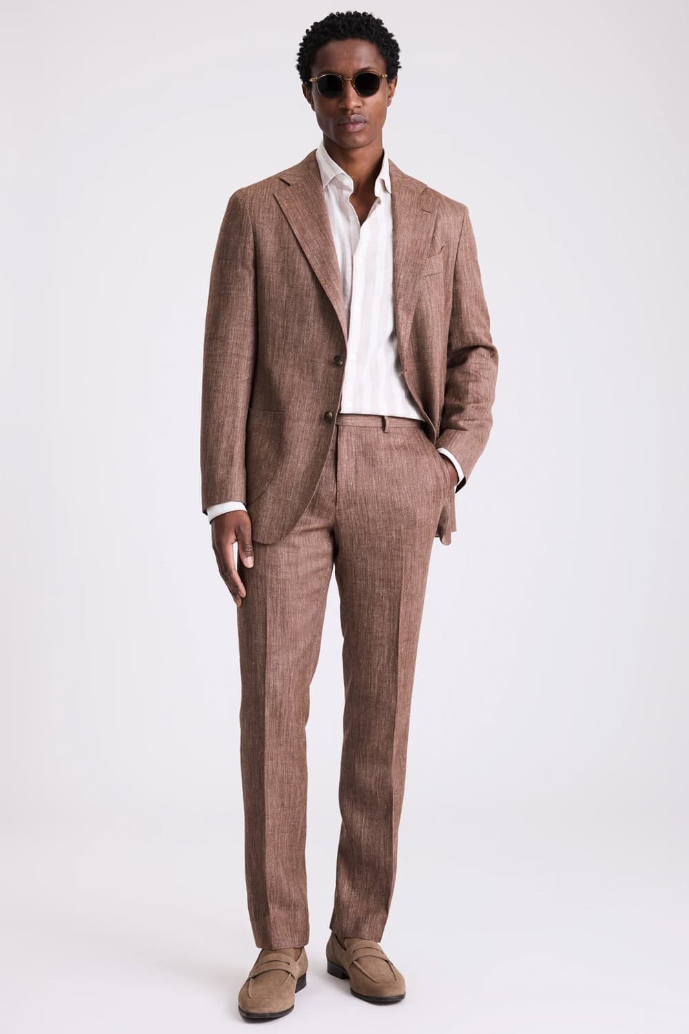 For example, a will-fitting, sand-coloured linen two piece may sound a bit bland. However, team it with a chambray shirt, a patterned pocket square and some laid-back suede loafers and you’ll soon change your mind.
