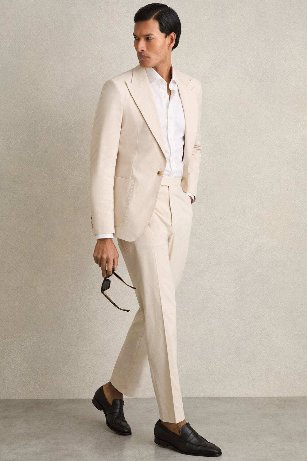 You’ll likely have one of these in your wardrobe already, which is fine – but be warned, if it’s a wool version then it will be much warmer than something in a cotton or linen blend. Colour wise, mid-to-light grey, navy or beige are your best bets here. Stay away from black as A) it can come across as a bit morbid, and B) you will be very, very hot.