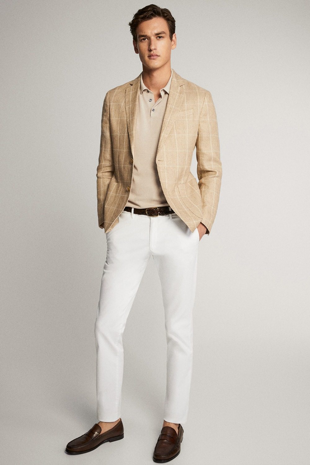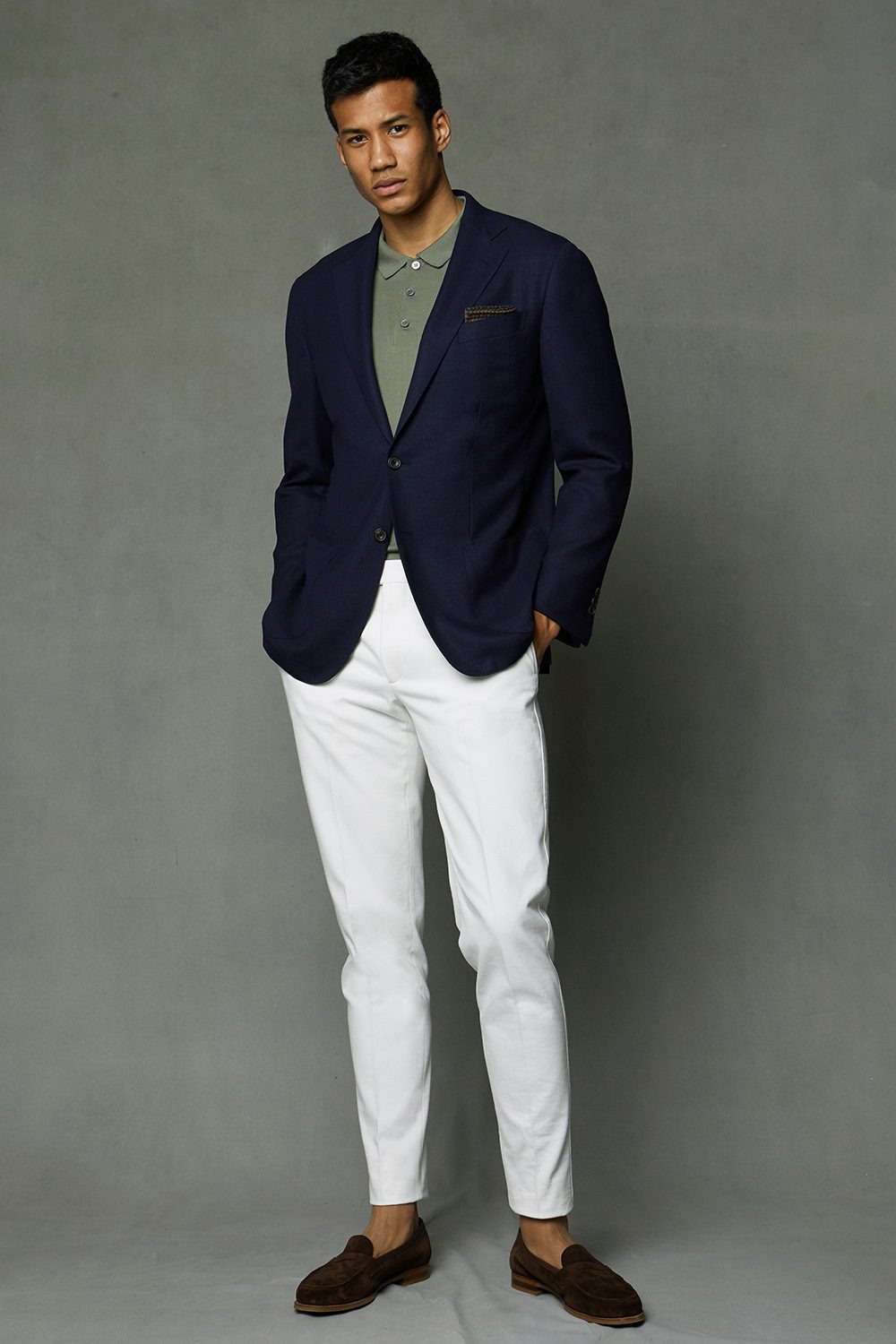 For spring and summer occasions, there are few blazer and trouser combinations better suited than green and white. Shade-wise, the jacket should be somewhere between olive and forest green, but equally important as colour is texture.