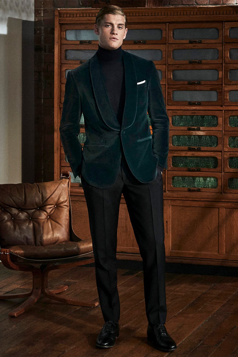 Black tie doesn’t necessarily mean black jacket. At festive parties and other formal events, you can always ditch the penguin suit for something less expected. A green velvet or jacquard dinner jacket is always a handsome switch. You only dial the formality down a little, but you’re guaranteed to stand out.