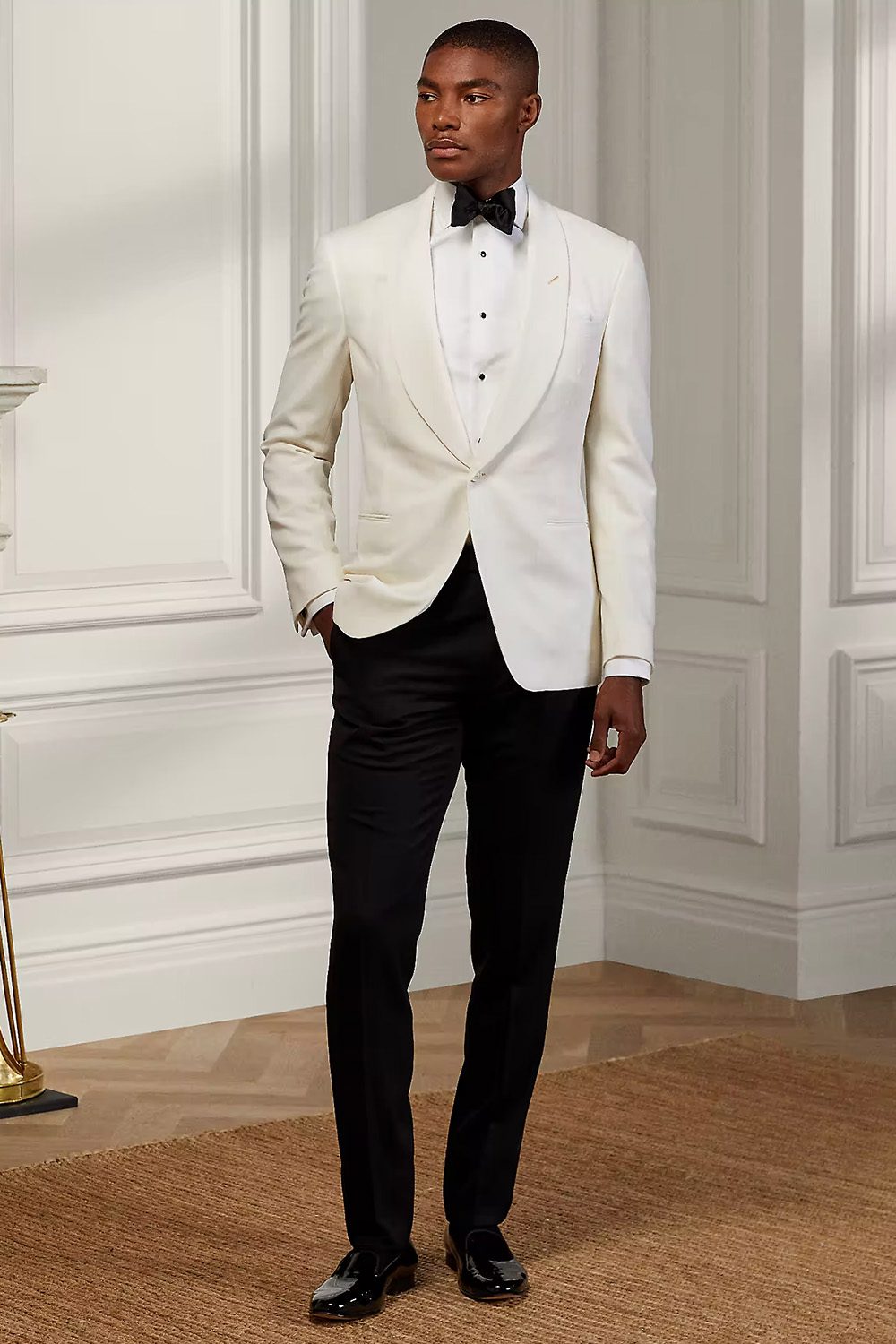 You’re unlikely to find a jacket in bright white, but keep walking if you do. You’re looking for an off-white or ivory to make this work so that the contrast with the black is soft and luxurious. Go formal with your accessories, too: a bow tie and some patent Oxfords. The red carnation on the lapel is a strictly personal choice…