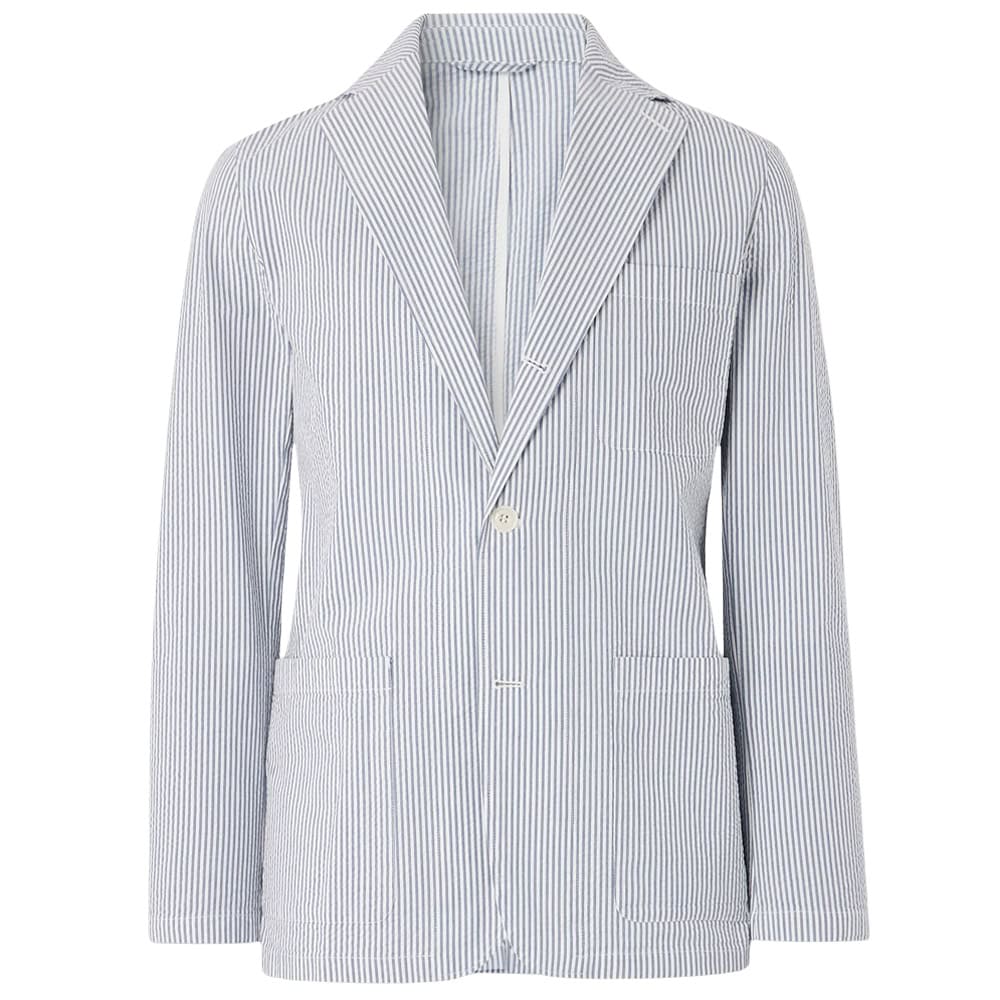 Seersucker is a great choice of material for the job, and its crinkled looks bring an even more laid-back vibe to the garment that works well for the time of year.