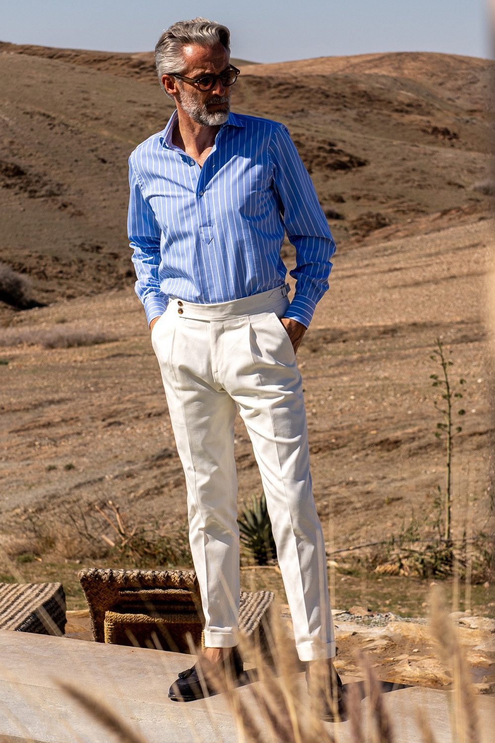 Another top-drawer summer outfit that would double as a brilliant evening look on vacation. We love the silhouette of the trousers, which are slightly wider than a regular straight-leg cut, while the contrast and colour created by the shirt bring the look energy and confidence.