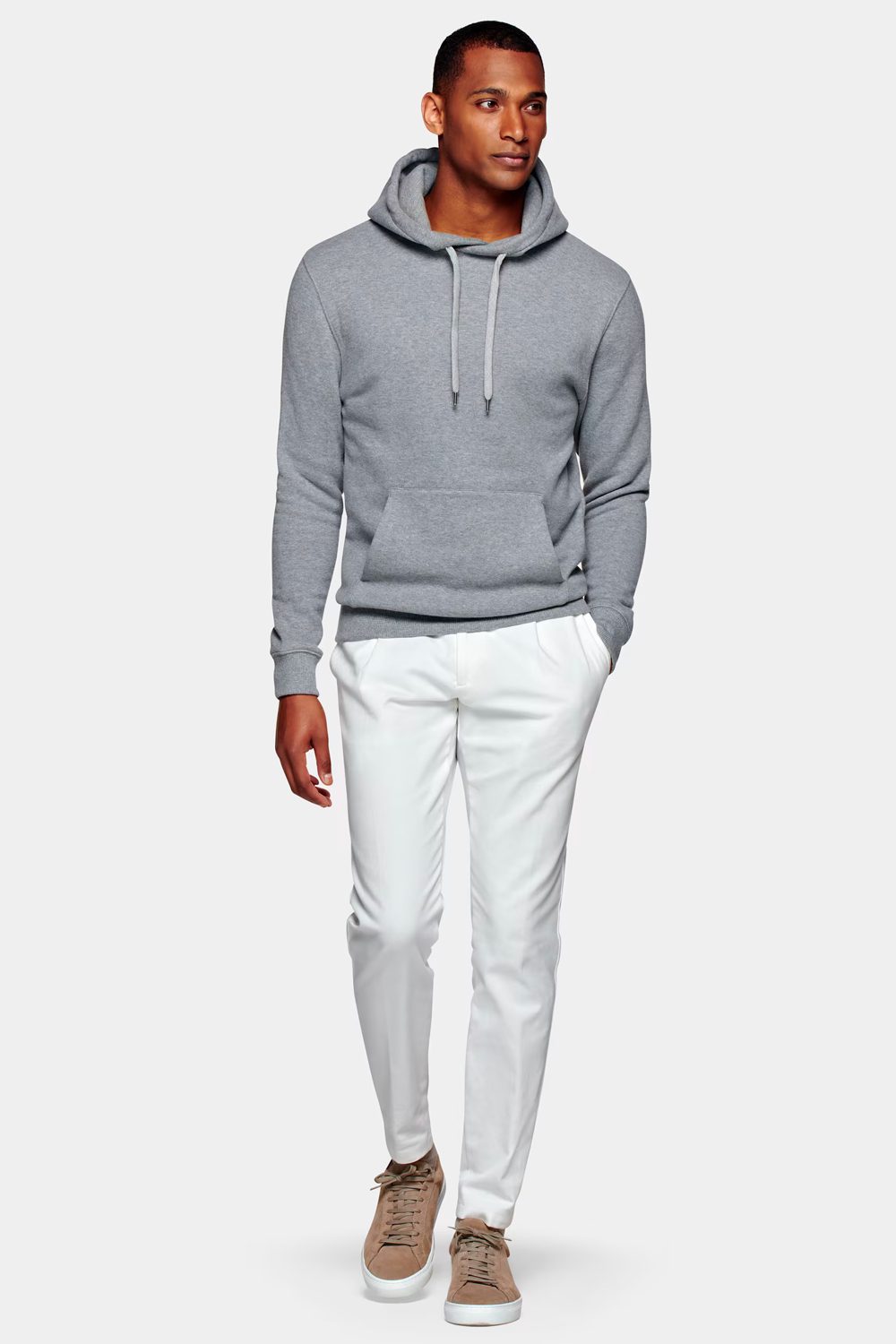 Where preppy meets sportswear, this look combines the slightly smart slim-cut pant silhouette with that icon of athletic attire, the hoodie.