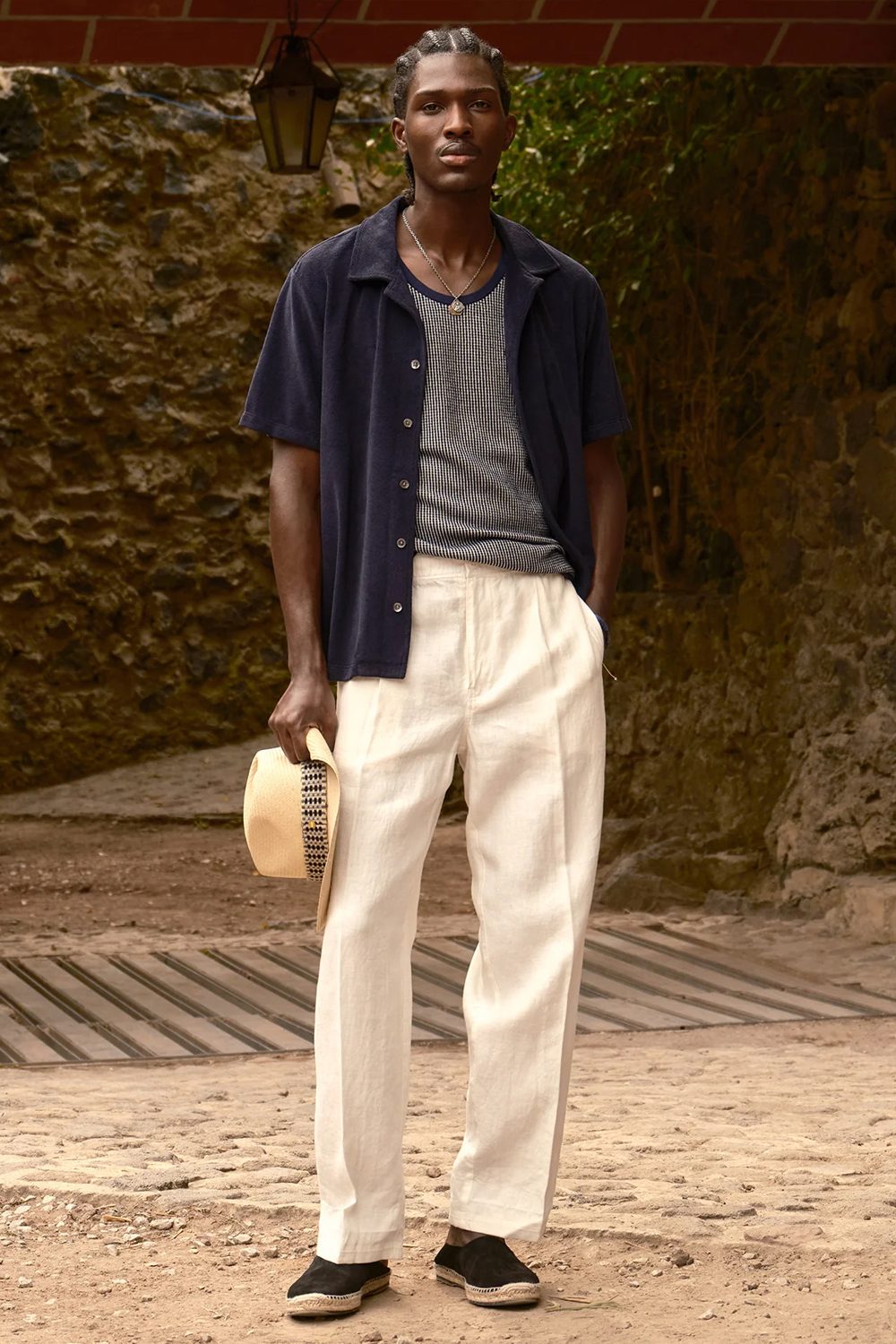 In this case, it’s with a navy vest and terry cloth short-sleeve shirt, neatly bound together by the navy espadrilles. Simple yet very effective, this look also bristles with interesting textures—always a good thing.