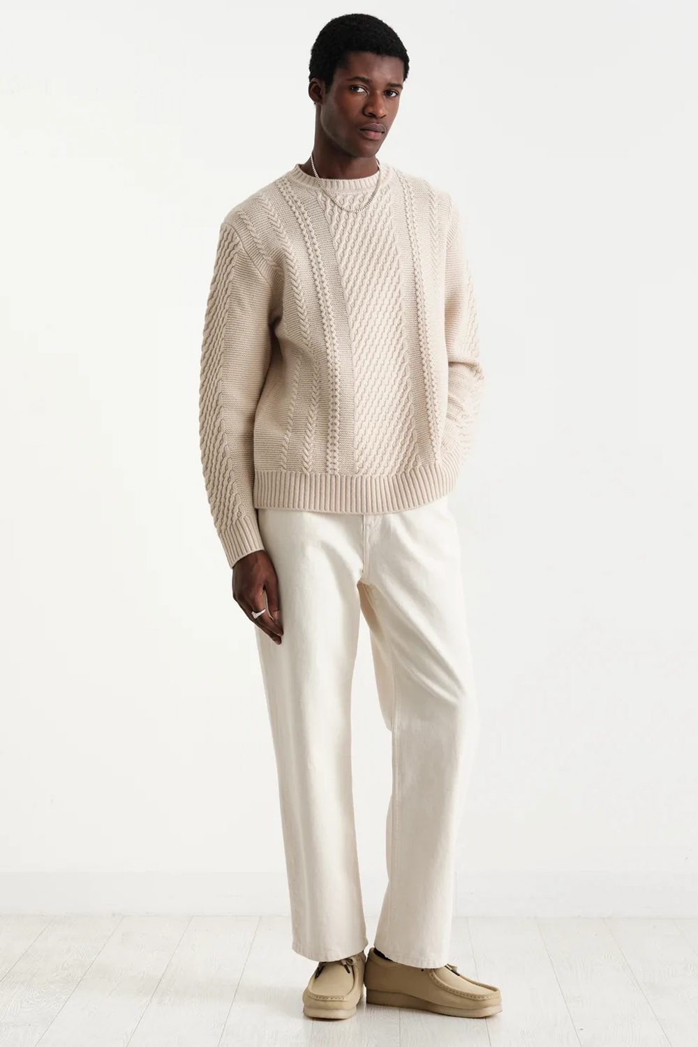 Neutral-tone outfits always scream elegance, and this one’s no different. The trousers’ cut is relaxed, with a straight-leg finish, but the addition of the texture-rich cream cable-knit crew neck and the dusty suede chukka boots really rounds off this look.