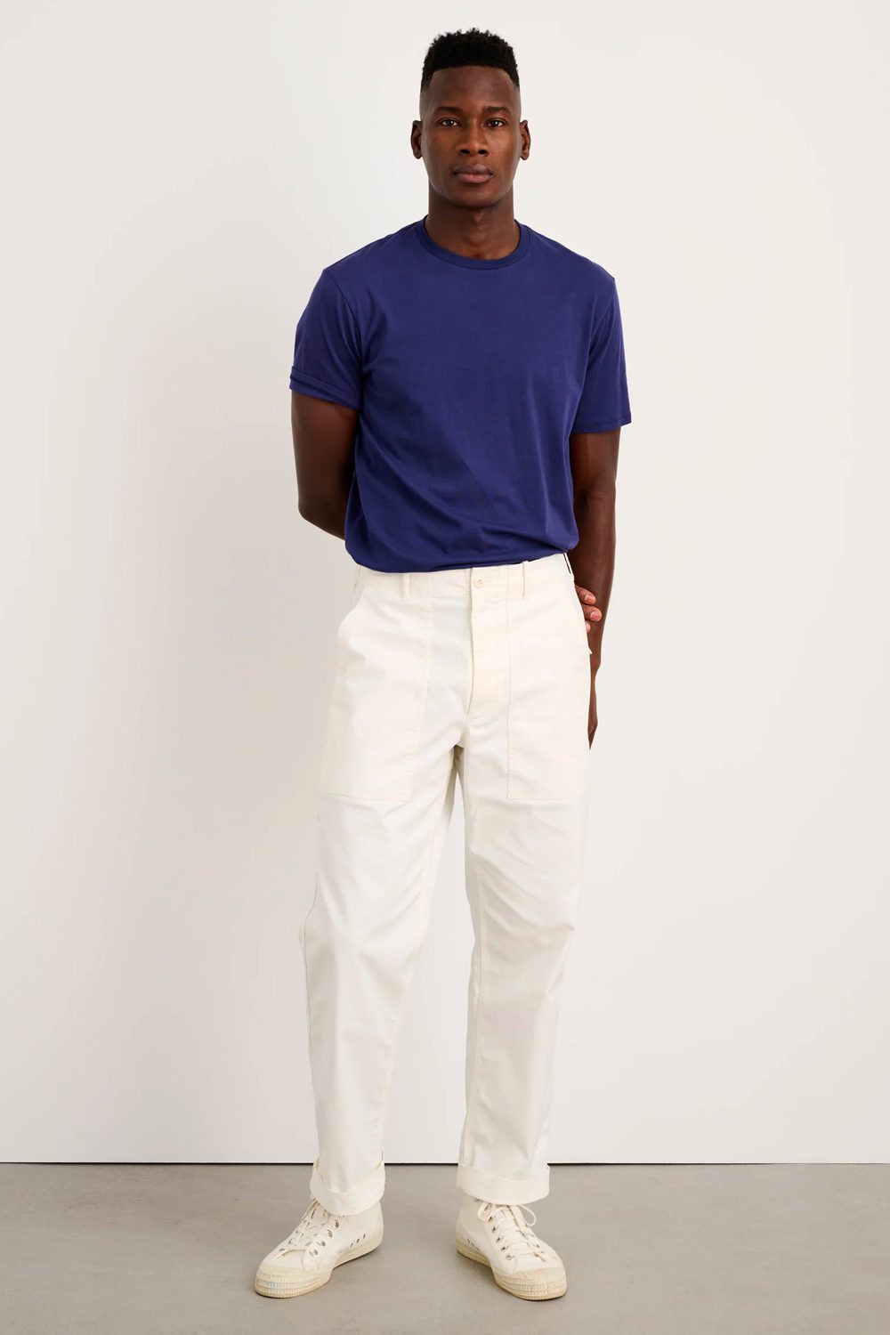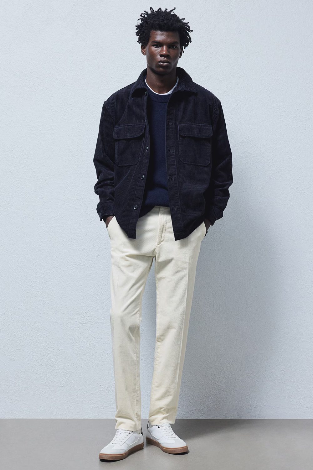 This look would lose all impact if worn with dark trousers—instead, the white tapered pants create a bright canvas which lets the subtle navy hues shine.