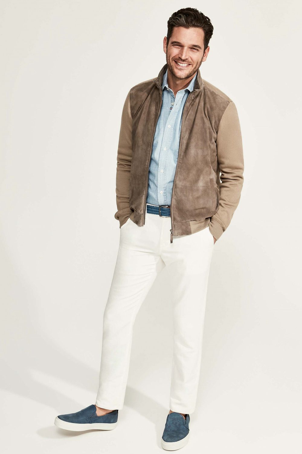 If you ever want to spice up your chino rotation, a pair of white ones is a good place to start. This slim style has a nice preppy feel to it, complemented by the navy slip-ons and the pale blue shirt.