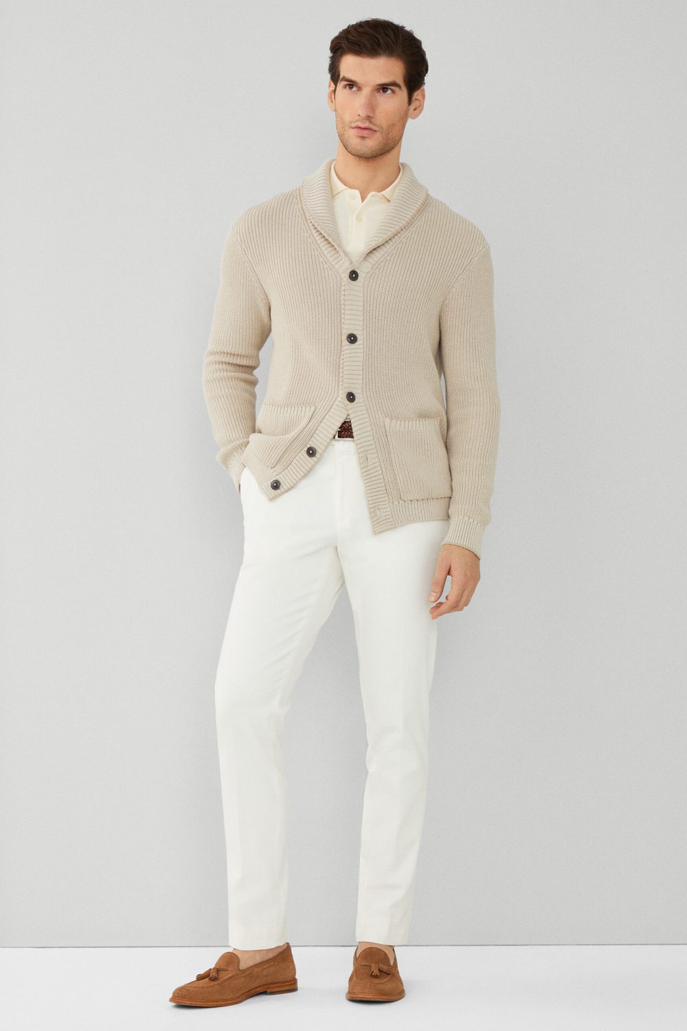 Rather than opt for a dark contrast, tonal cream hues are used instead, with the shawl collar cardigan offering a punch of texture and tactility.