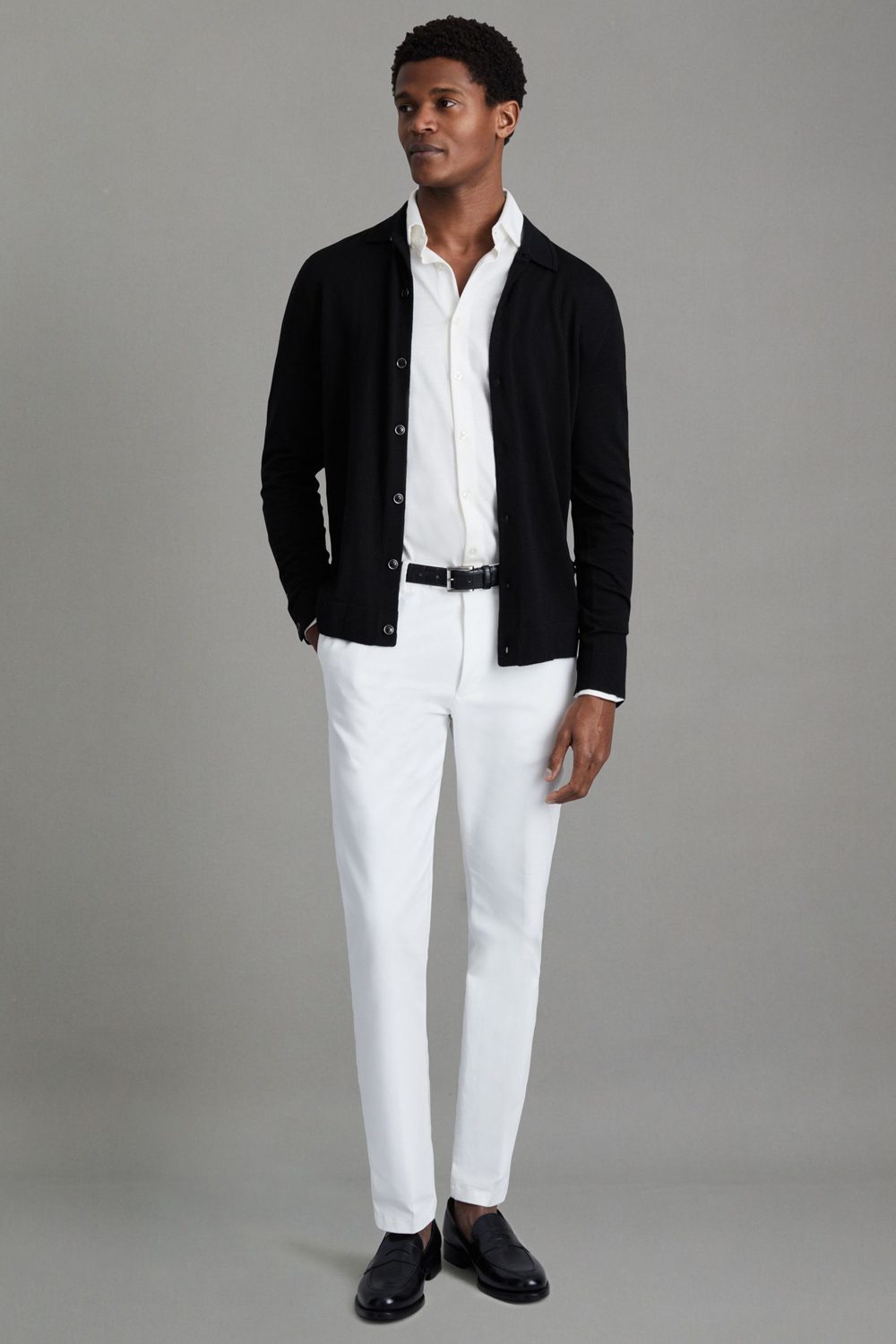 The cream-tone shirt softens the contrast between the two halves, but the navy cardigan underscores the look’s smart-casual credentials with its soft contours and textured finish.