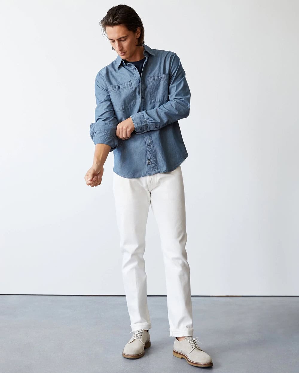 One thing that puts a lot of men off experimenting with chambray is that it can be tricky to style, especially with jeans – but it can be done. When wearing with denim down below make sure the washes (i.e. shades) are different enough to contrast as anything too similar will look jarring. For a fail-safe approach, switch your jeans for chinos in a lighter shade such as beige, off-white or stone.
