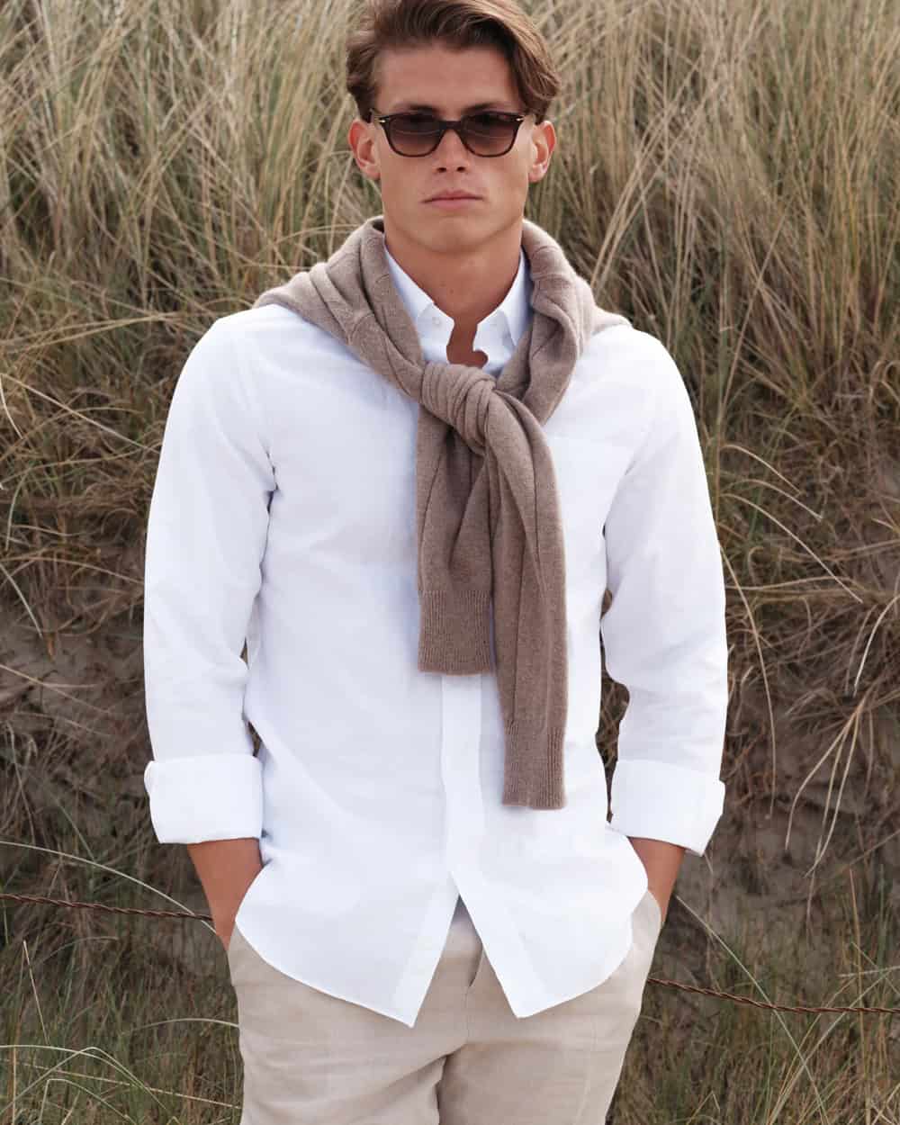 For the most part, linen shirts work best worn casually. Try teaming one with chino shorts and loafers, with the sleeves loosely cuffed. That’s not to say they can’t be worn with tailoring. Combine with suit separates, tortoiseshell shades and desert boots for a relaxed take on summer wedding attire.